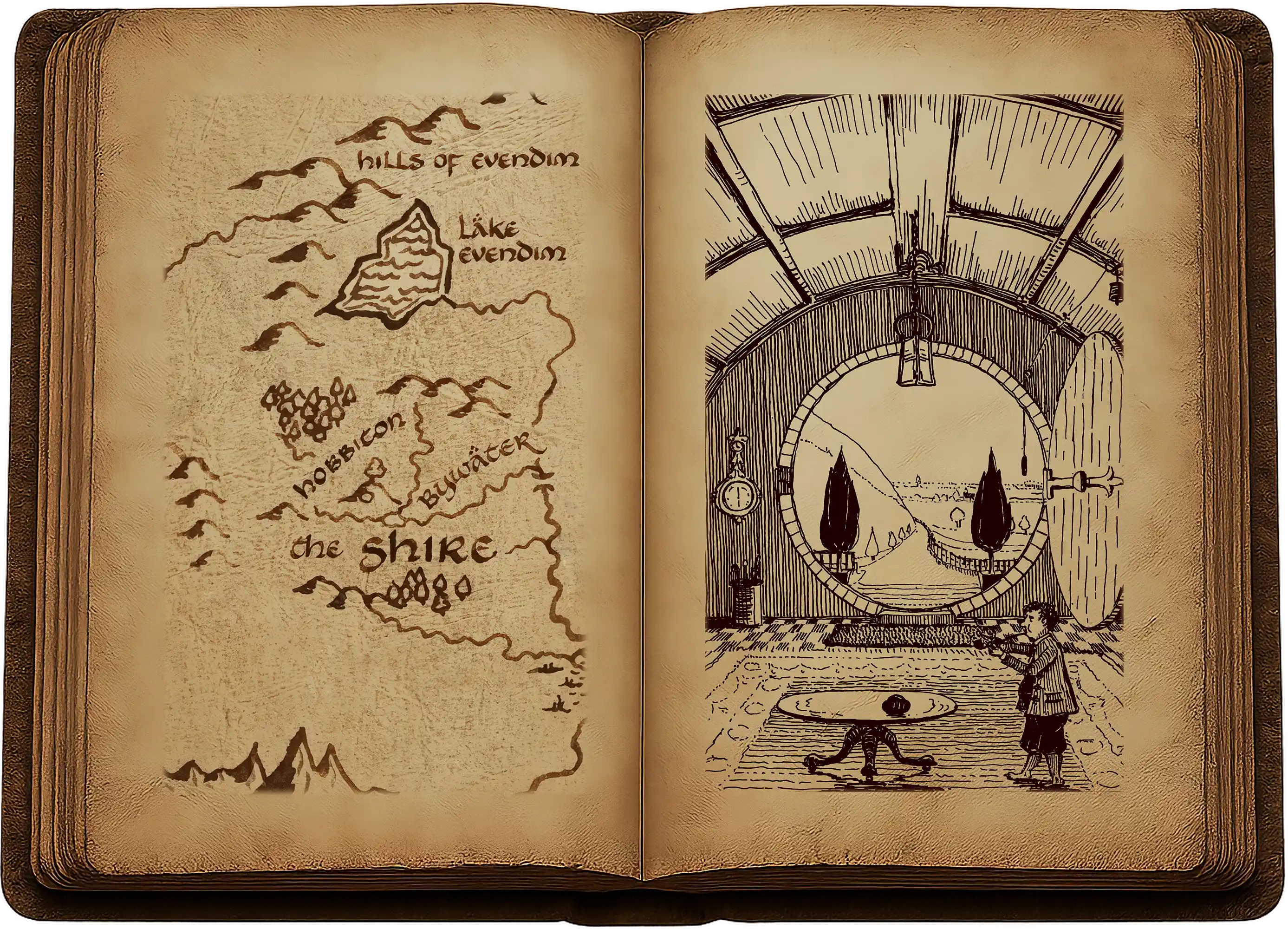Sa porte, peinte en vert, était parfaitement ronde comme un hublot, avec un étincelant bouton de cuivre jaune placé exactement au centre. Elle s’ouvrait sur un hall en forme de tube, comme un tunnel ; un tunnel très confortable et sans fumée, avec des murs recouverts de lambris, un sol carrelé et garni de tapis, pourvu de chaises bien astiquées et de nombreuses patères pour accrocher chapeaux et manteaux : ce hobbit aimait la visite. Le tunnel s’enfonçait profondément, presque en ligne droite mais pas tout à fait, dans le flanc de la colline – La Colline, comme tout le monde l’appelait à des lieues à la ronde – et de nombreuses petites portes rondes s’ouvraient de chaque côté, une à gauche, puis l’autre à droite. Le hobbit ne montait jamais d’escaliers : chambres, salles de bain, caves, garde-manger (nombreux), penderies (il y avait des pièces entières consacrées aux vêtements), cuisines, salles à manger – tout était au même étage et le long d’un même corridor. Les plus belles pièces se trouvaient toutes à gauche (en entrant), car c’étaient les seules à avoir des fenêtres, des fenêtres rondes, dans de belles niches, qui donnaient sur son jardin et sur les prés au-delà, descendant vers la rivière.