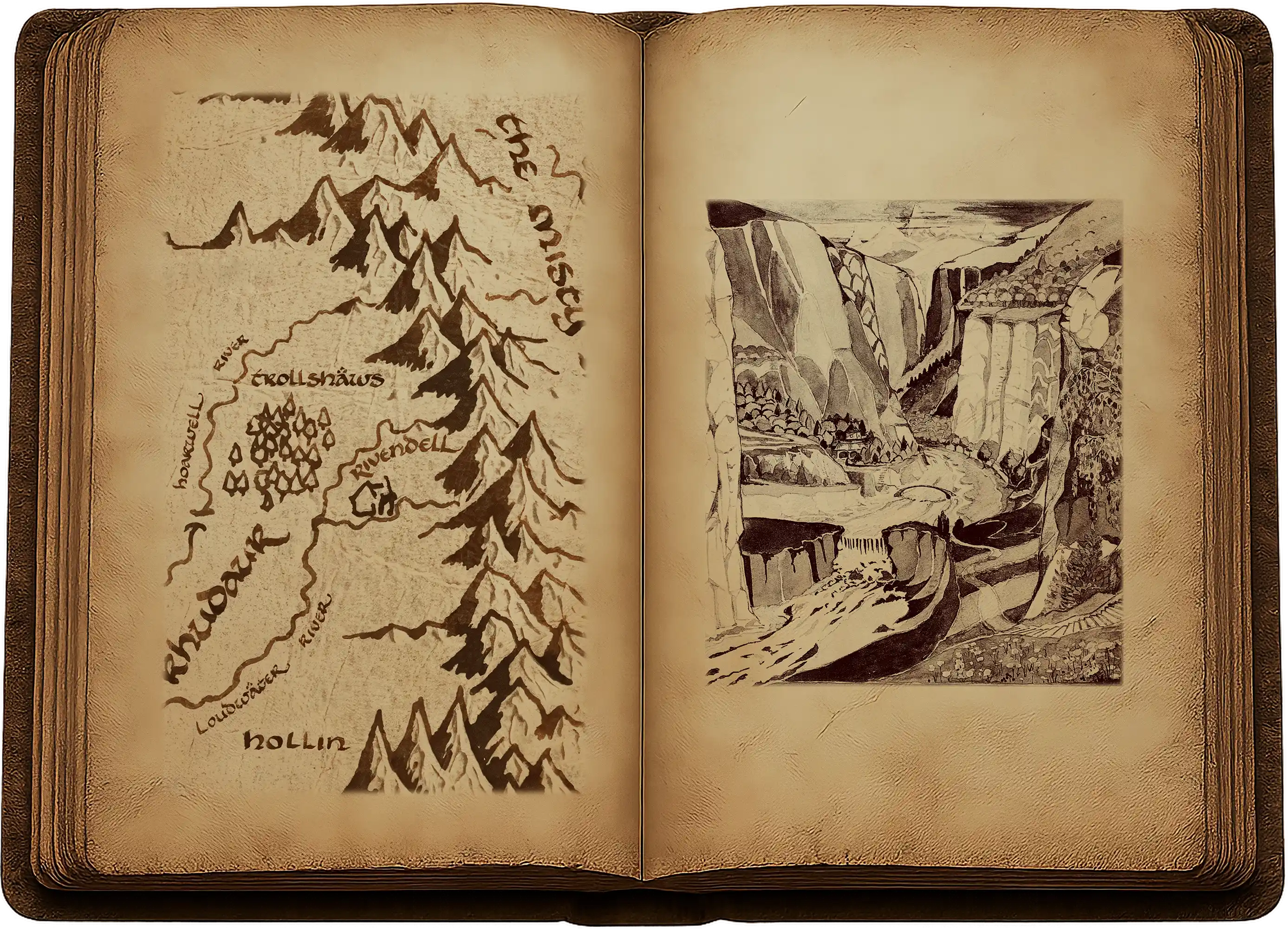 Bilbo n’oublia jamais comment, ce soir-là au crépuscule, ils dégringolèrent le chemin sinueux et escarpé qui menait dans la vallée secrète de Fendeval. L’air se réchauffait à mesure qu’ils descendaient, et l’odeur de pin lui donnait sommeil, si bien que, de temps à autre, il s’endormait et manquait de tomber, ou se cognait le nez sur l’encolure du poney. Plus ils s’enfonçaient dans la vallée, plus ils reprenaient courage. Les pins cédèrent le pas aux hêtres et aux chênes. Il y avait dans le soir une atmosphère réconfortante. Les dernières touches de vert avaient presque disparu dans l’herbe lorsqu’ils arrivèrent enfin à une clairière non loin au-dessus des rives du cours d’eau.