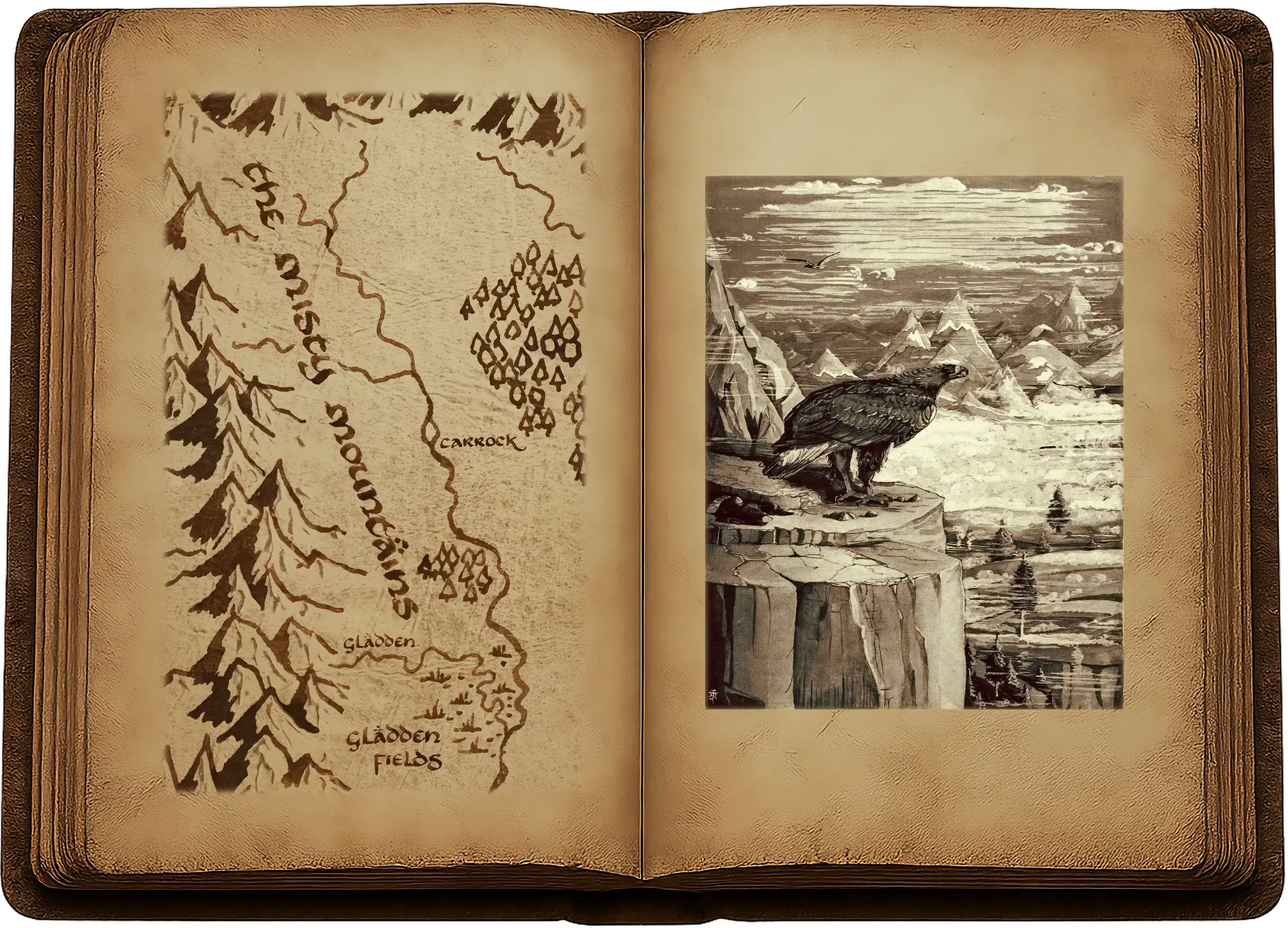 Au bout d’un long moment, les aigles durent repérer l’endroit où ils se dirigeaient, même à cette hauteur vertigineuse, car ils se mirent à descendre en décrivant de grandes spirales. Ils tourbillonnèrent longtemps ainsi, puis le hobbit rouvrit enfin les yeux. Ils s’étaient beaucoup rapprochés du sol. En bas, on voyait des arbres qui ressemblaient à des chênes et à des ormes, ainsi que de vastes prairies et un long cours d’eau qui les traversait. Mais là, surgissant de terre en plein milieu du cours d’eau qui le contournait de chaque côté, se dressait un grand rocher, presque une colline de pierre, comme un avant-poste des lointaines montagnes, ou un immense bloc lancé à des lieues dans la plaine par un géant parmi les géants.