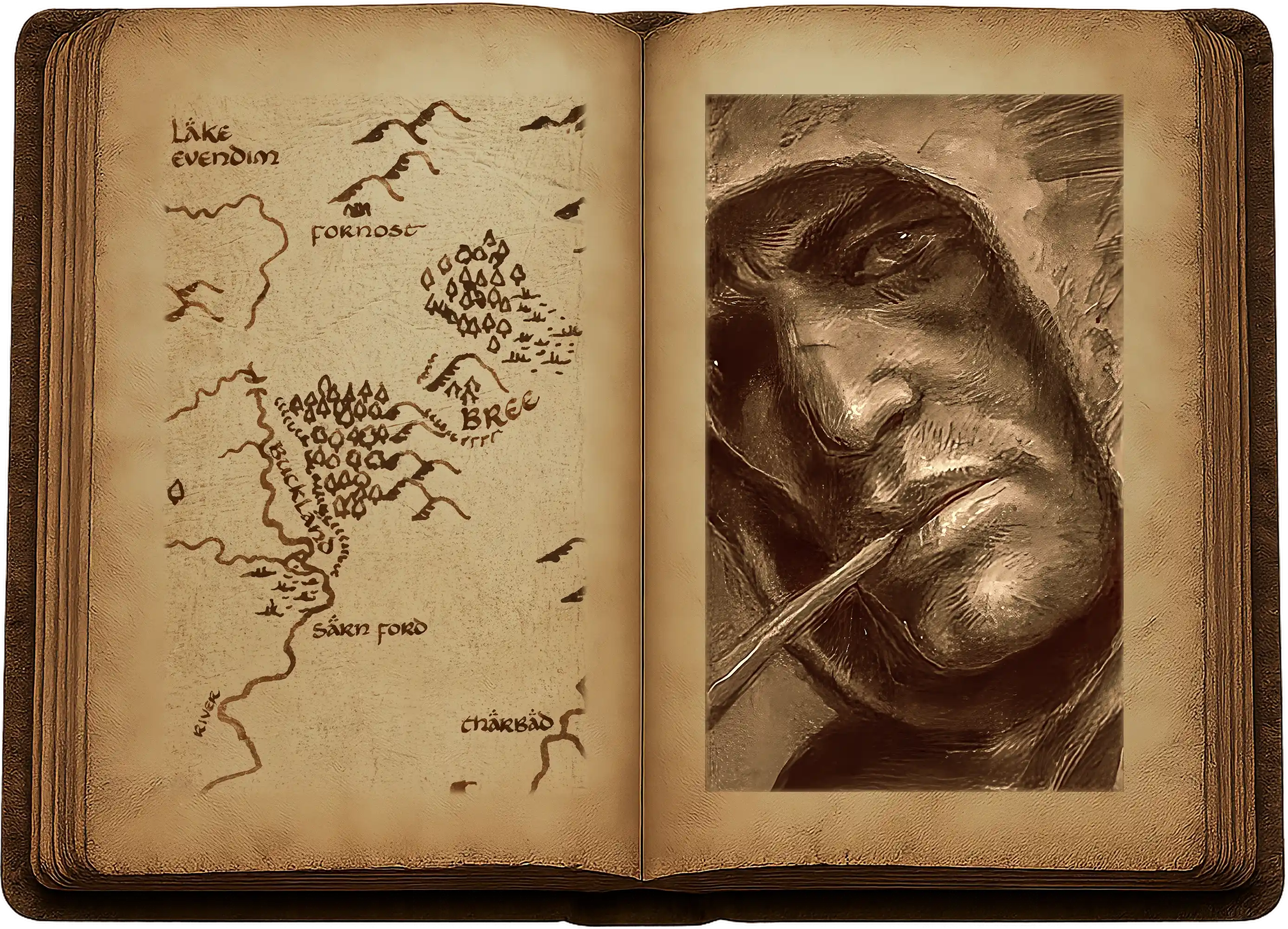 Soudain, Frodo remarqua qu’un homme d’allure étrange, marqué par les intempéries, prêtait également une oreille attentive à la conversation des hobbits. Assis dans l’ombre près du mur, il avait devant lui un grand pot à bière et fumait une pipe à long tuyau, curieusement sculptée. Ses jambes étaient étendues, laissant voir de grandes bottes de cuir souple qui lui convenaient bien, mais qui avaient beaucoup d’usure et étaient à présent crottées de boue. Une lourde cape de toile vert foncé, salie par le voyage, l’enserrait de près, et malgré la chaleur de la pièce, il portait un capuchon qui assombrissait son visage ; mais on pouvait voir la lueur dans ses yeux tandis qu’il observait les hobbits.