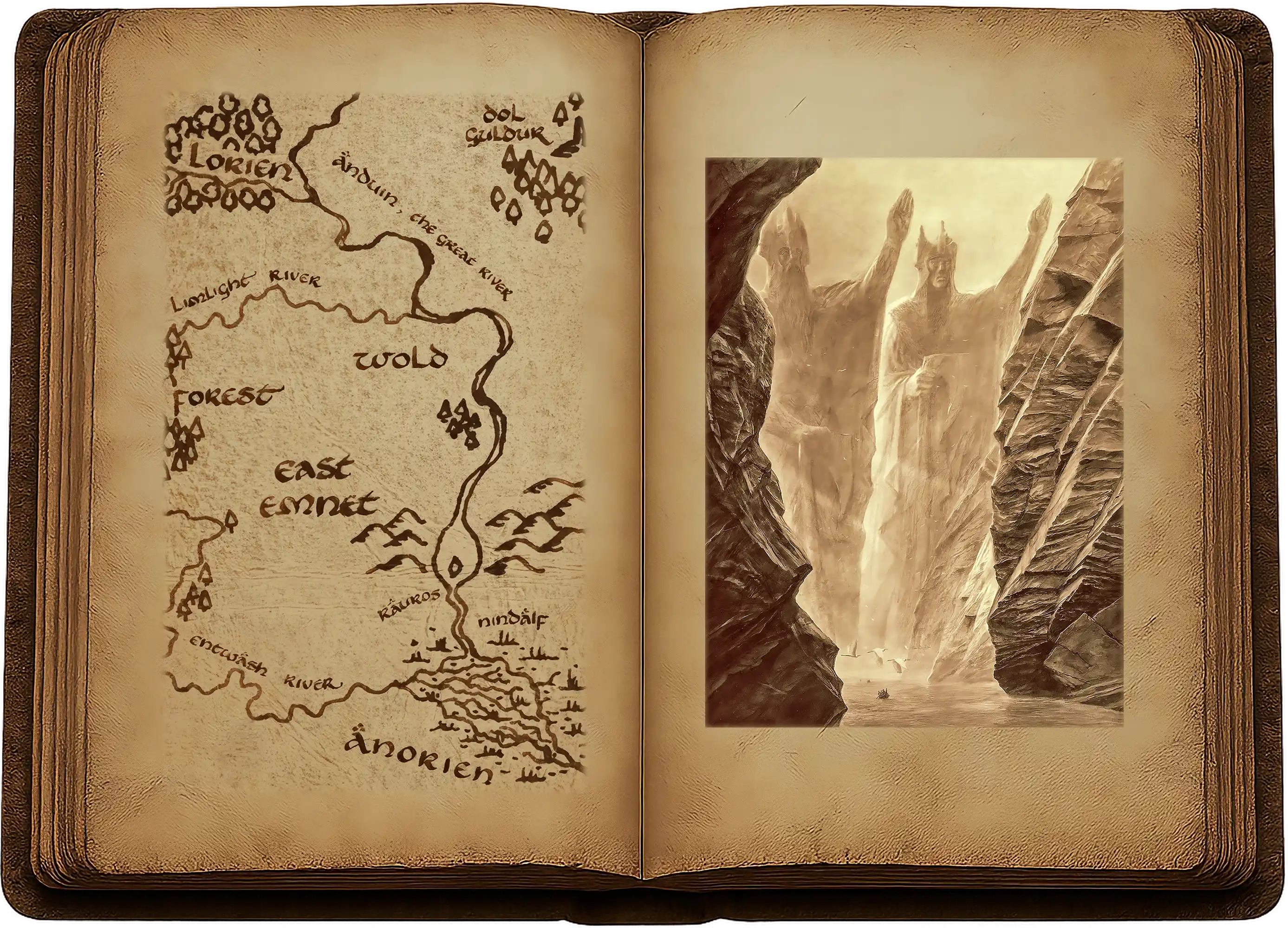 Frodo, scrutant le lointain, vit s’avancer deux grands rochers, comme de hauts pics ou d’immenses colonnes de pierre. Ils se dressaient, grands et sinistres, de part et d’autre du cours d’eau. Une ouverture étroite apparut entre eux : le Fleuve les emportait vers celle-ci.