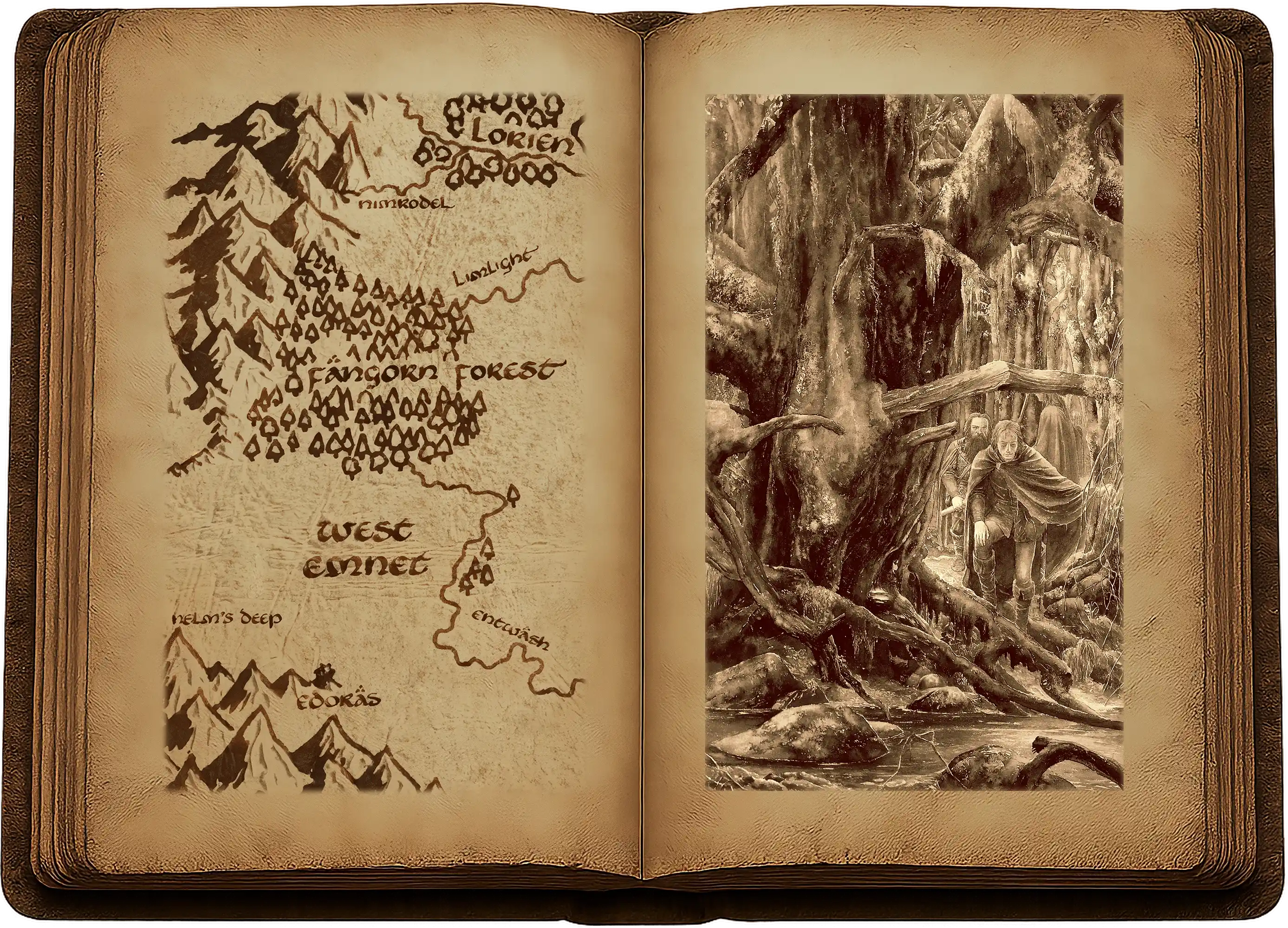 Sur ce, les trois chasseurs plongèrent dans la forêt de Fangorn. Legolas et Gimli laissèrent le pistage à Aragorn. Il eut peu de chose à relever. Le sol de la forêt était sec et couvert de feuilles mortes ; mais Aragorn, supposant que les fugitifs resteraient près de la rivière, retournait souvent aux rives du cours d’eau. C’est ainsi qu’il découvrit l’endroit où Merry et Pippin avaient bu et s’étaient baigné les pieds. Là se trouvaient, bien à la vue de tous, les empreintes de deux hobbits, et l’un semblait un peu plus petit que l’autre.
