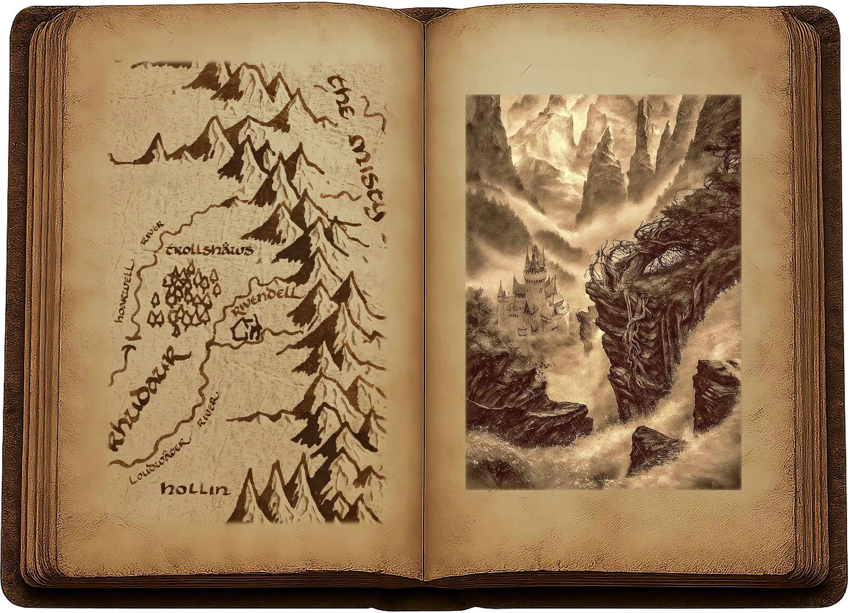 Tous écoutèrent alors, tandis qu’Elrond, de sa voix claire, parlait de Sauron et des Anneaux de Pouvoir, forgés au Deuxième Âge du monde, il y a fort longtemps. Une partie de son récit était connue de quelques-uns de ceux qui étaient là, mais nul ne le savait en entier, et bien des yeux observaient Elrond avec crainte et émerveillement tandis qu’il évoquait les forgerons elfes de l’Eregion, leur amitié avec les nains de la Moria, et leur soif de connaissance, par laquelle Sauron les leurra. Car Sauron, en ce temps-là, n’avait pas encore sinistre figure, et ils reçurent son aide et acquirent un grand savoir-faire, tandis que lui découvrait tous leurs secrets ; et il les trahit, forgeant dans la Montagne du Feu l’Anneau Unique afin de devenir leur maître. Mais Celebrimbor le décela, et il cacha les Trois qu’il avait créés ; et ce fut la guerre, et le pays fut dévasté, et la porte de la Moria fut close.