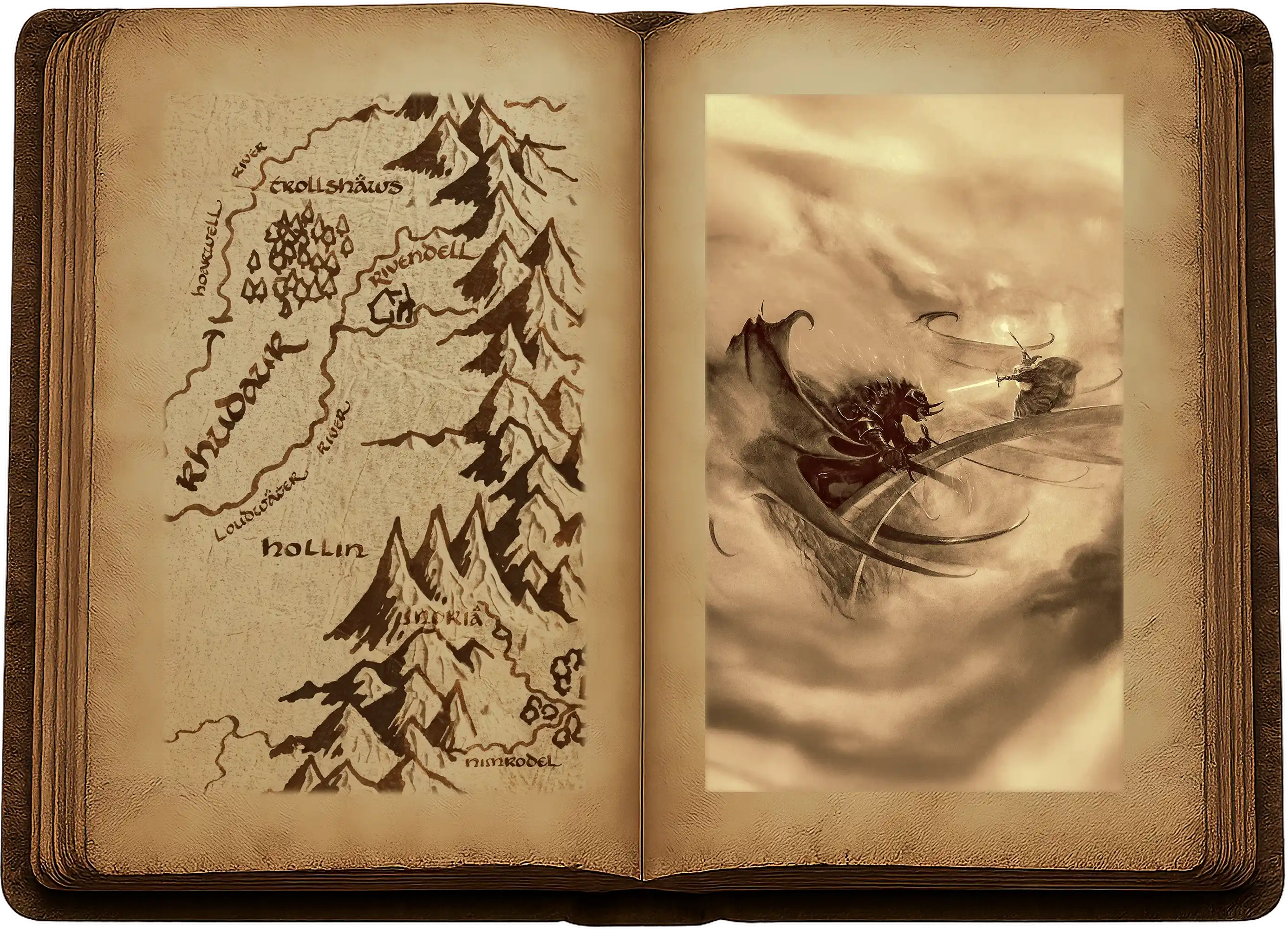 De l’ombre surgit une épée rouge feu. Glamdring brilla blanche en retour. Il y eut un choc retentissant et un jet de flammèches blanches. Le Balrog recula, et son épée vola en éclats fondus. Sur le pont, le magicien chancela, fit un pas en arrière et se tint de nouveau immobile.