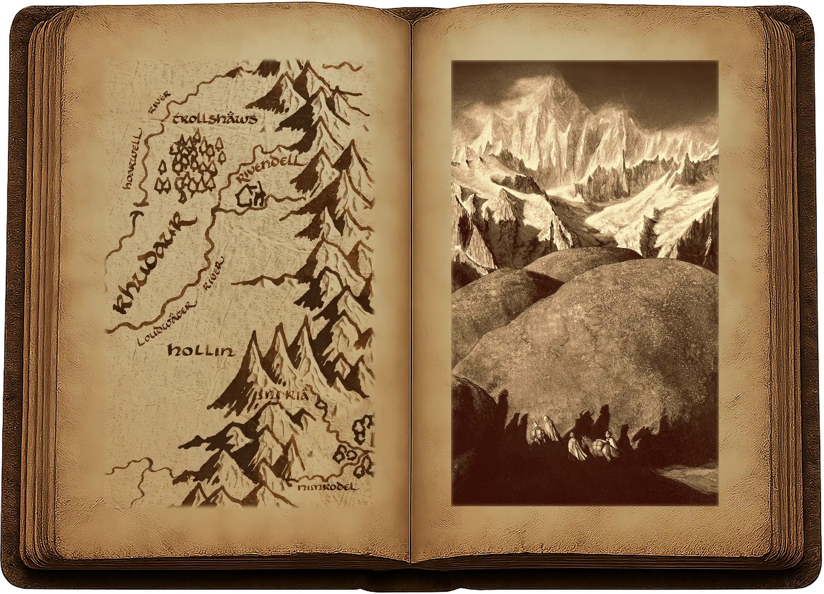 « D’après les signes que nous avons vus récemment, dit Gandalf, je crains que la Porte de Cornerouge ne soit surveillée ; et le temps qui se dessine derrière nous me fait également douter. Il pourrait y avoir de la neige. Nous devons autant que possible nous dépêcher. Même alors, il nous faudra plus de deux longues marches avant d’atteindre le sommet du col. L’obscurité viendra tôt ce soir. Nous devrons partir aussitôt que vous serez prêts. »