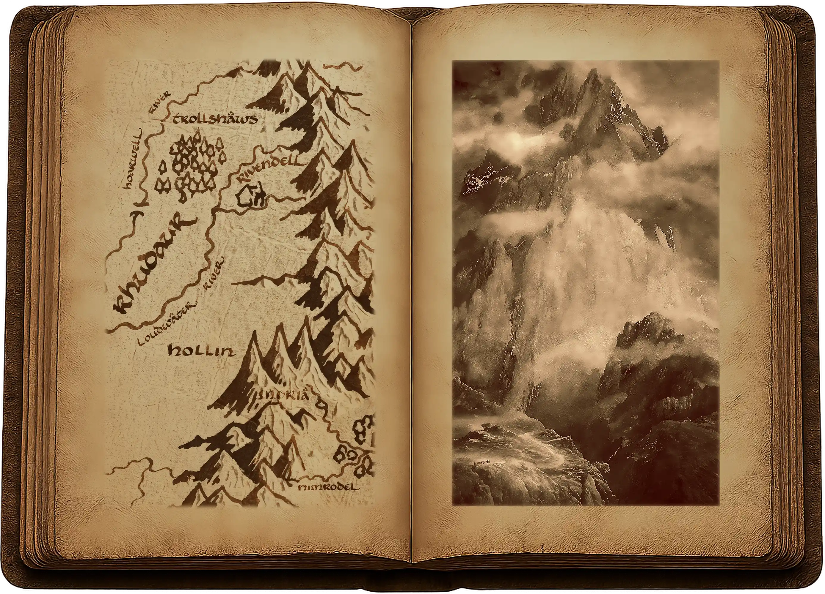 « D’après les signes que nous avons vus récemment, dit Gandalf, je crains que la Porte de Cornerouge ne soit surveillée ; et le temps qui se dessine derrière nous me fait également douter. Il pourrait y avoir de la neige. Nous devons autant que possible nous dépêcher. Même alors, il nous faudra plus de deux longues marches avant d’atteindre le sommet du col. L’obscurité viendra tôt ce soir. Nous devrons partir aussitôt que vous serez prêts. »