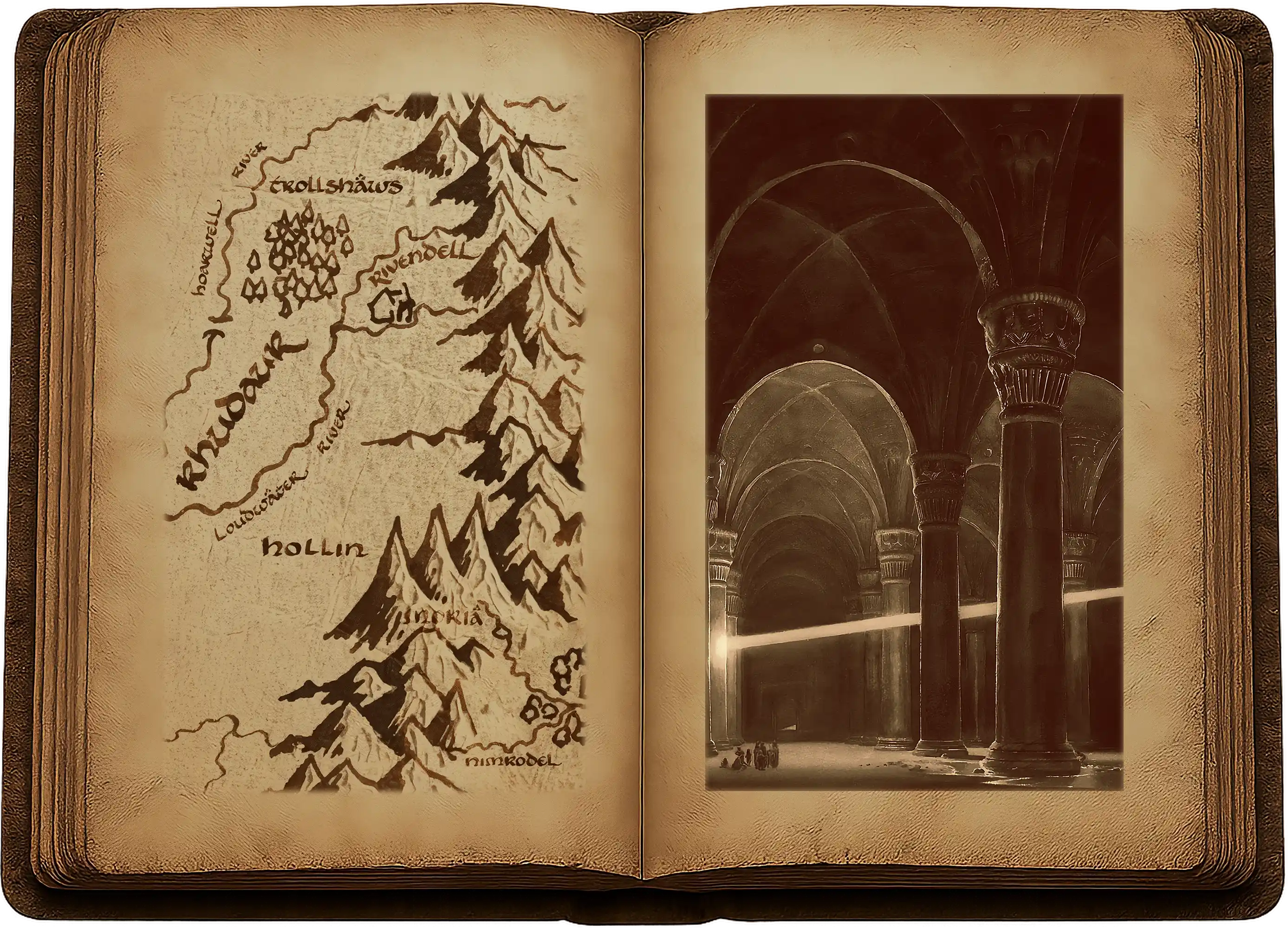 Aux quatre murs se voyaient de nombreuses niches taillées à même le roc, dans lesquelles se trouvaient de grands coffres de bois à armature de fer. Tous avaient été éventrés et pillés ; mais non loin du couvercle fracassé de l’un d’eux, gisaient les restes d’un livre. Tailladé, lardé de coups de couteau et partiellement brûlé, il était si souillé de noir et d’autres taches sombres, semblables à du sang séché, qu’il en devenait presque impossible à lire. Gandalf le ramassa avec précaution, mais les feuillets se craquelèrent et cassèrent quand il le déposa sur la dalle. Il l’étudia quelque temps sans mot dire. Debout à ses côtés, Frodo et Gimli purent voir, tandis qu’il tournait délicatement les pages, qu’elles étaient parcourues de maintes écritures différentes, en runes, tant de la Moria que du Val, et çà et là en lettres elfiques.