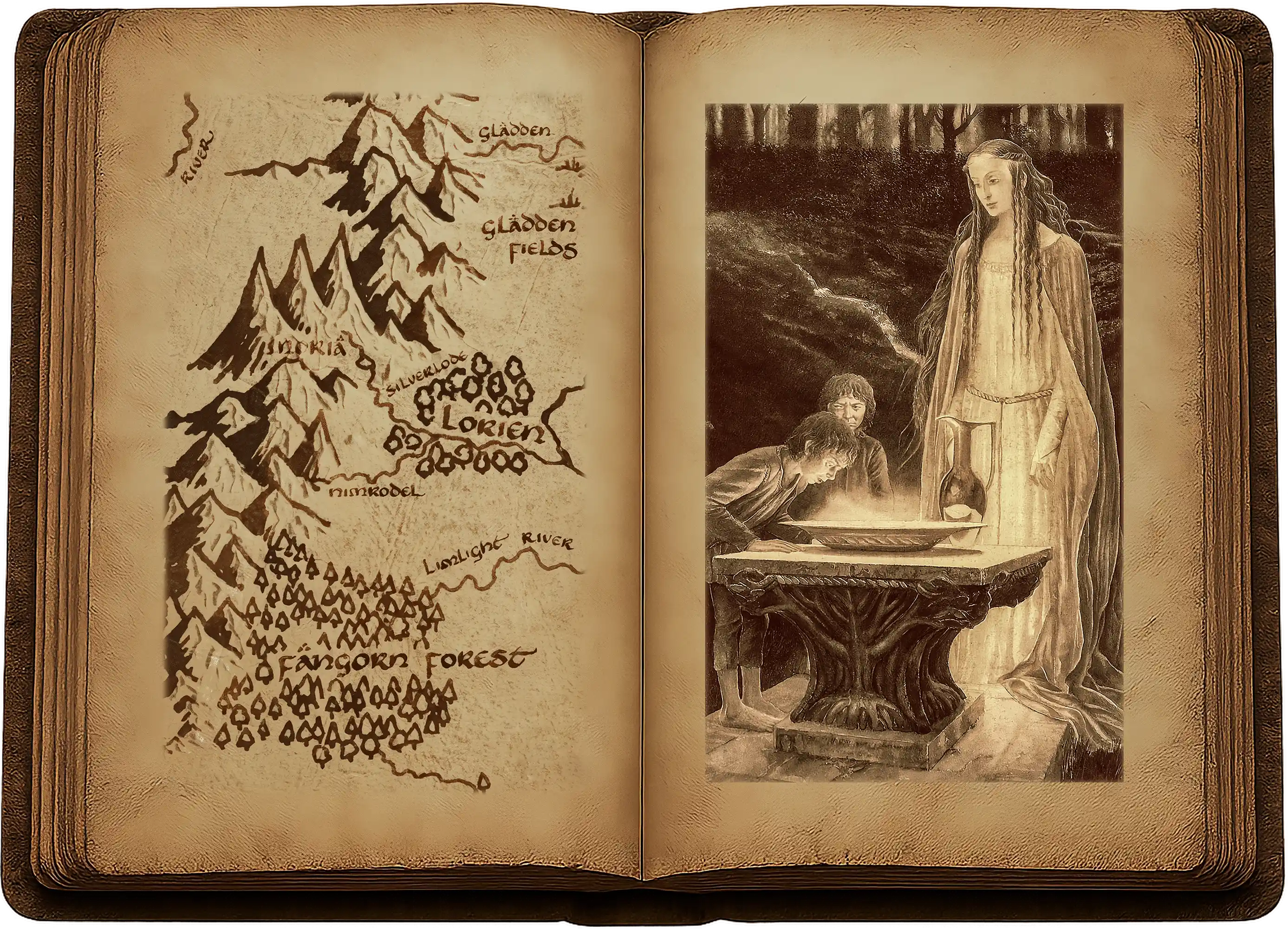 « Ne touche pas à l’eau ! » dit doucement la dame Galadriel. La vision s’évanouit, et Frodo s’aperçut qu’il regardait les froides étoiles scintiller dans la vasque d’argent. Tremblant de tous ses membres, il fit un pas en arrière et regarda la Dame.