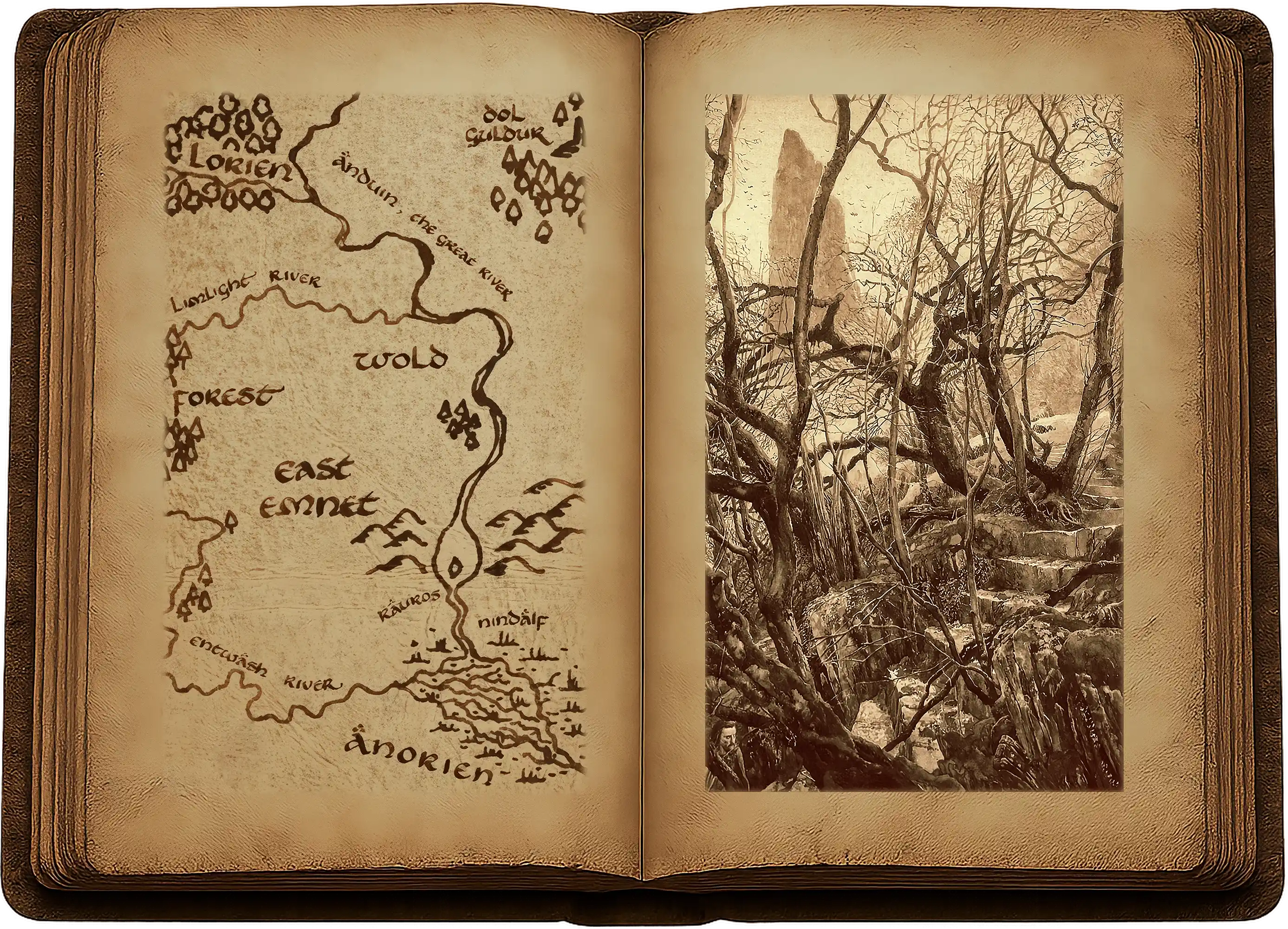 Après avoir erré sans but à travers le bois, Frodo sentit que ses pas le conduisaient vers les pentes de la colline. Il parvint à un sentier, restes à demi effacés d’une route de l’ancien temps. Aux endroits abrupts, des escaliers de pierre avaient été taillés, mais ils étaient beaucoup érodés et fendus, partout malmenés par les racines des arbres. Frodo grimpait depuis un certain temps, sans se soucier d’où il allait, lorsqu’il parvint à un endroit herbeux. Des sorbiers poussaient alentour, et une grande pierre plate se trouvait au milieu. Cette petite pelouse surélevée était ouverte sur l’est, et elle était à présent inondée de soleil matinal. Frodo s’arrêta et regarda par-dessus les eaux du Fleuve, vers Tol Brandir et les oiseaux qui tournoyaient dans l’immense gouffre d’air qui le séparait de l’île vierge. La voix du Rauros montait comme un formidable rugissement, mêlée d’un grondement profond et vibrant.