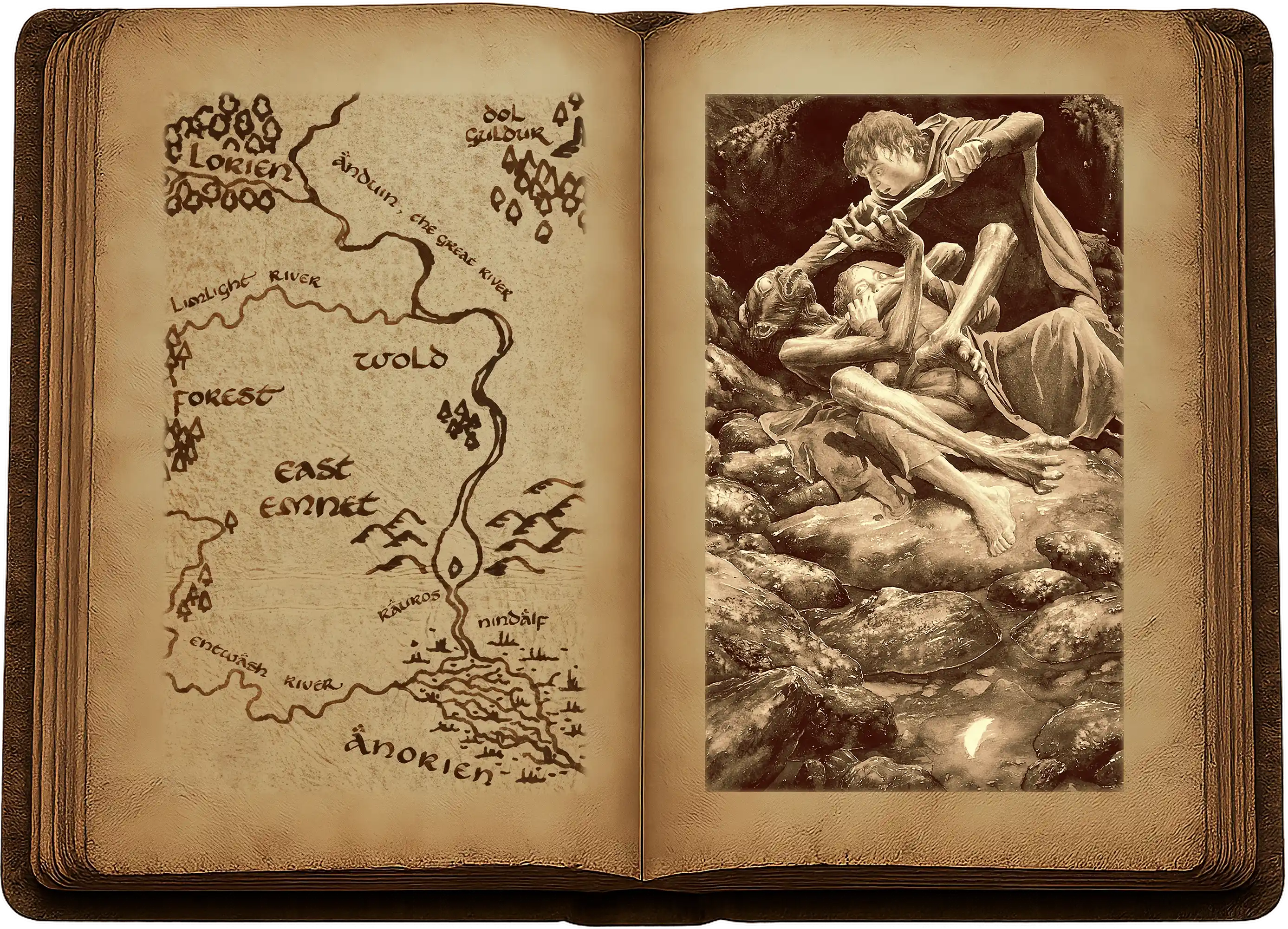 Frodo regarda droit dans les yeux de Gollum, qui vacillèrent et se dérobèrent. « Tu le sais, ou tu le devines assez bien, Sméagol, dit-il d’un ton posé et sévère. Nous allons au Mordor, évidemment. Et tu connais le chemin, je crois. »
