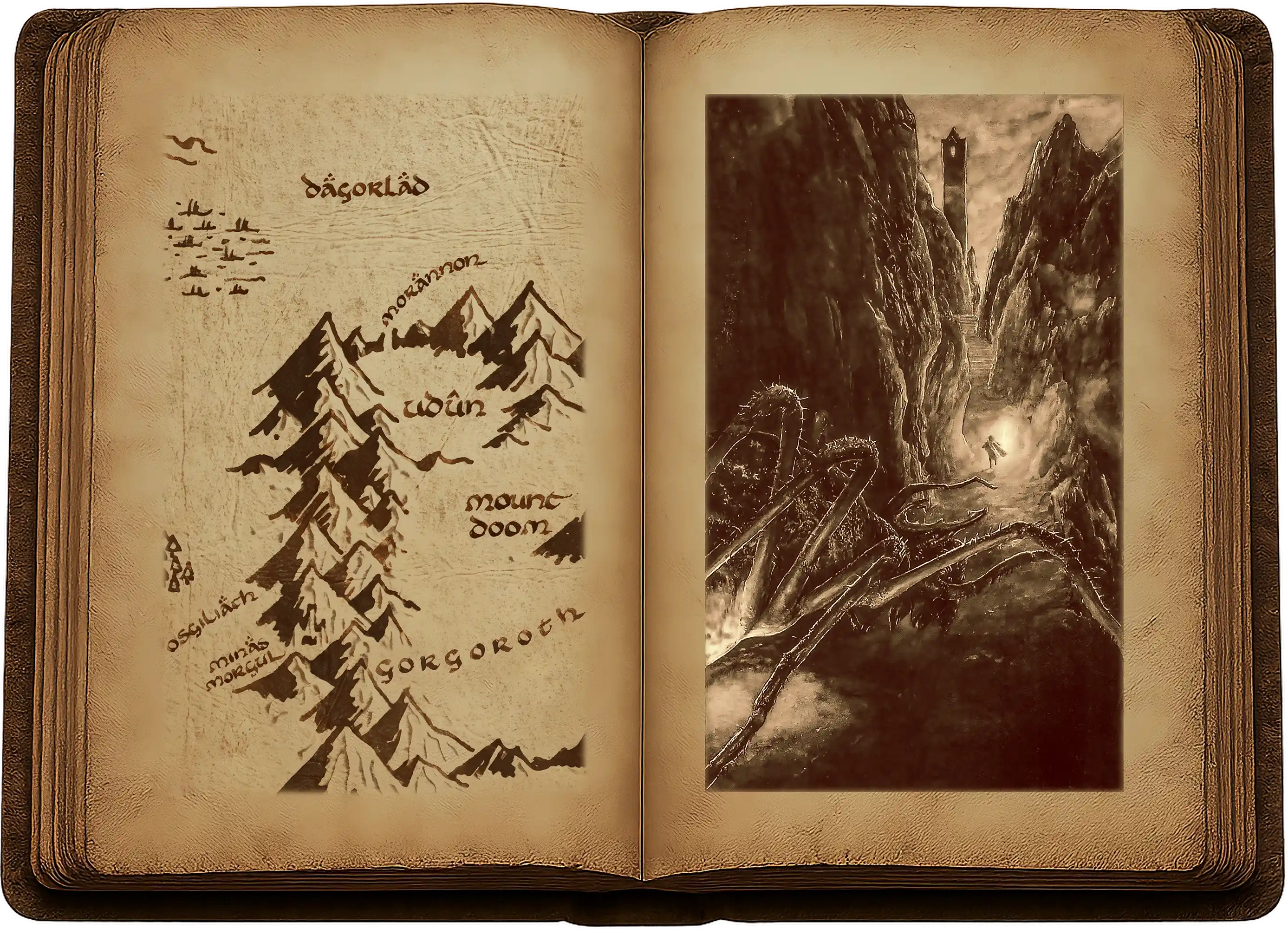 Ce pays obscur parut clair à ses yeux qui venaient de passer dans l’antre de la nuit. Les grandes fumées étaient plus hautes et moins épaisses, et les dernières heures d’une sombre journée s’écoulaient ; le rougeoiement du Mordor avait laissé place à une morne pénombre. Pourtant, Frodo eut l’impression d’ouvrir les yeux sur un matin tout à coup rempli d’espoir. Il était presque arrivé au sommet de la muraille. Encore un peu et ça y était. La Fente, Cirith Ungol, se dressait devant lui telle une faille sombre dans la crête noire, les cornes de rocher obscurcissant le ciel de part et d’autre. Encore un sprint et il serait de l’autre côté !