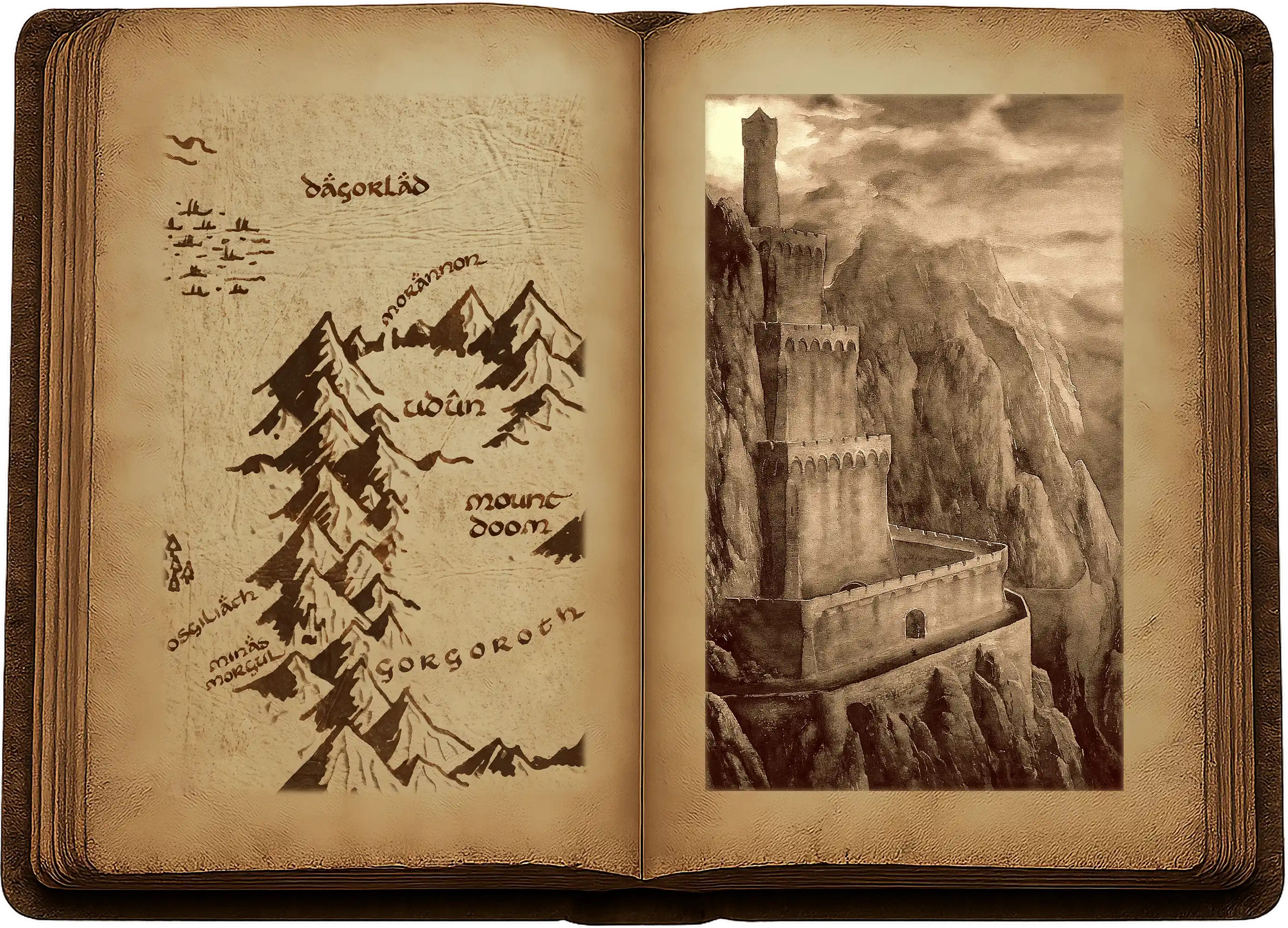 Sam remarqua deux livrées, l’une marquée de l’Œil Rouge, l’autre d’une Lune défigurée par un horrible visage de mort ; mais il ne s’arrêta pas pour les examiner. Au fond de la cour, une grande porte était entrouverte au pied de la Tour ; une lueur rouge en sortait, un grand orque gisait mort sur le seuil. Sam entra, sautant par-dessus le cadavre ; puis il scruta les environs d’un œil dérouté.