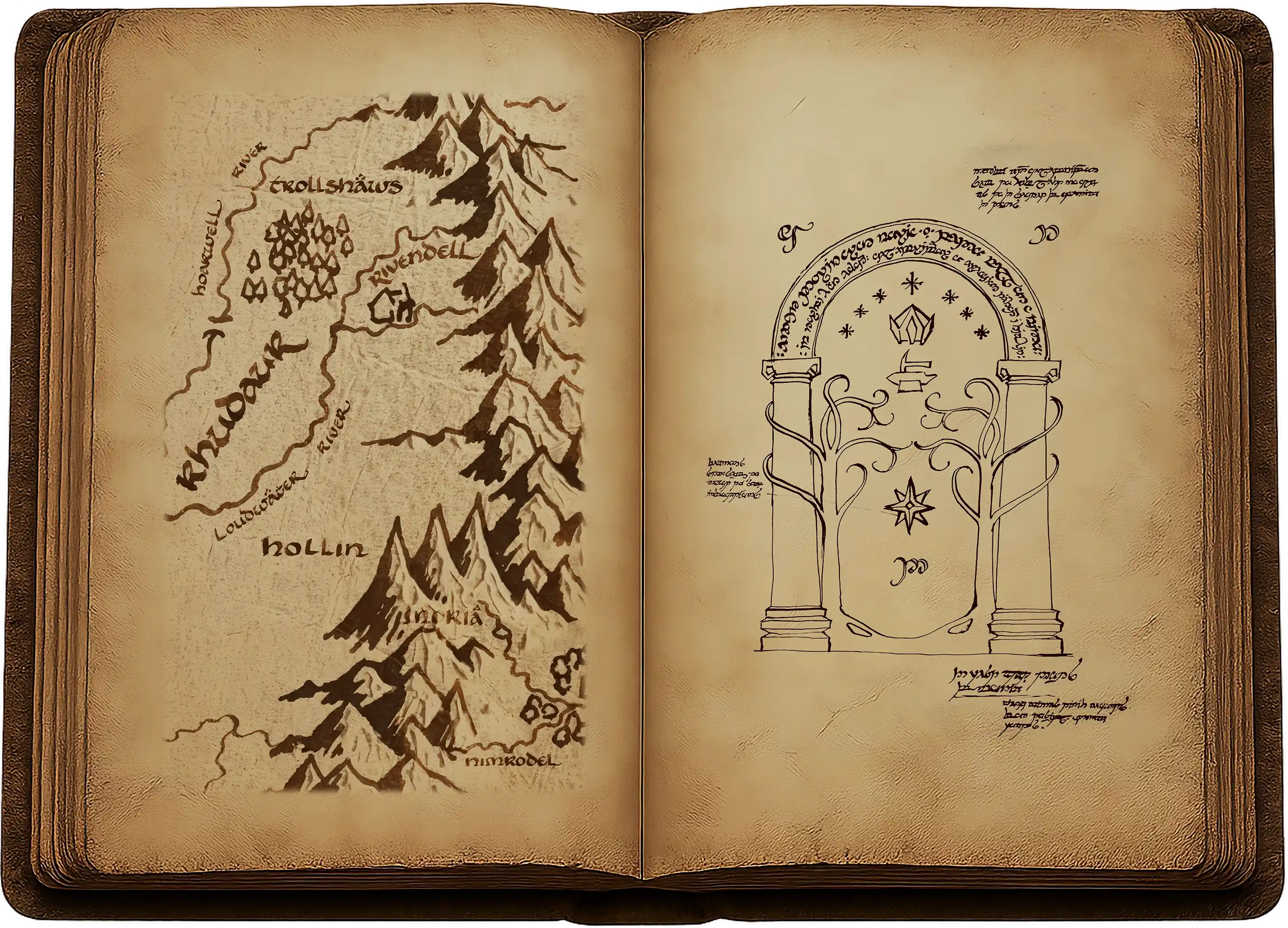 Tout en haut, aussi haut que Gandalf pouvait tendre les bras, se voyait une arche parcourue d’un entrelacement de caractères elfiques. Sous elle, bien que par endroits les fils aient été estompés ou brisés, se discernait le contour d’une enclume et d’un marteau surmontés d’une couronne aux sept étoiles. Plus bas encore se trouvaient deux arbres, chacun portant à ses branches des croissants de lune. Enfin, plus claire que le reste, au centre de la porte, brillait une unique étoile aux multiples rayons.