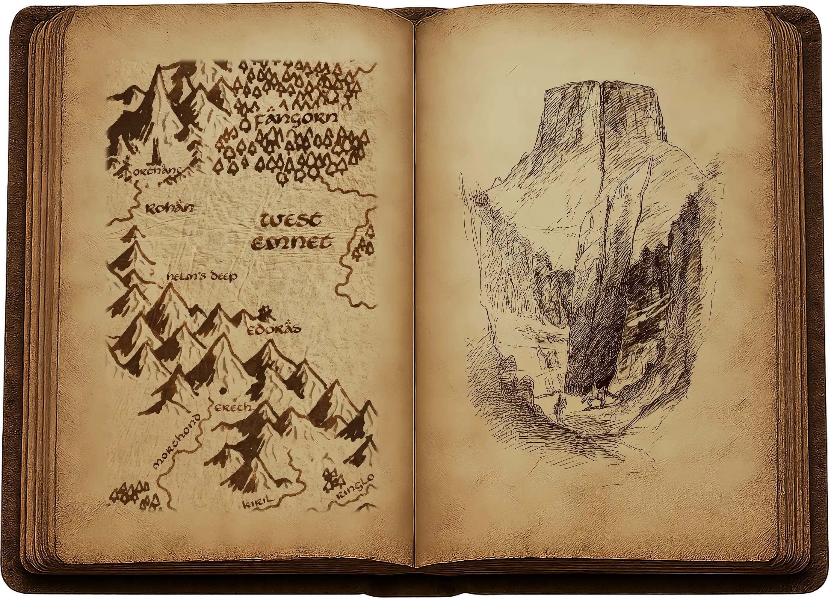 « Mon sang se glace dans mes veines », dit Gimli ; mais personne ne répondit, et le son de sa voix retomba sans vie sur les aiguilles de sapin humides répandues à ses pieds. Les chevaux refusèrent de contourner la sinistre pierre, et leurs cavaliers durent mettre pied à terre pour les conduire. Ainsi, ils finirent par arriver au creux du vallon, où se dressait une haute paroi rocheuse ; et dans cette paroi s’ouvrait la Porte Sombre, béante, comme la bouche de la nuit. Des signes et des figures, effacés et impossibles à lire, étaient gravés au-dessus de sa large voussure, et la peur en émanait telle une vapeur grise.