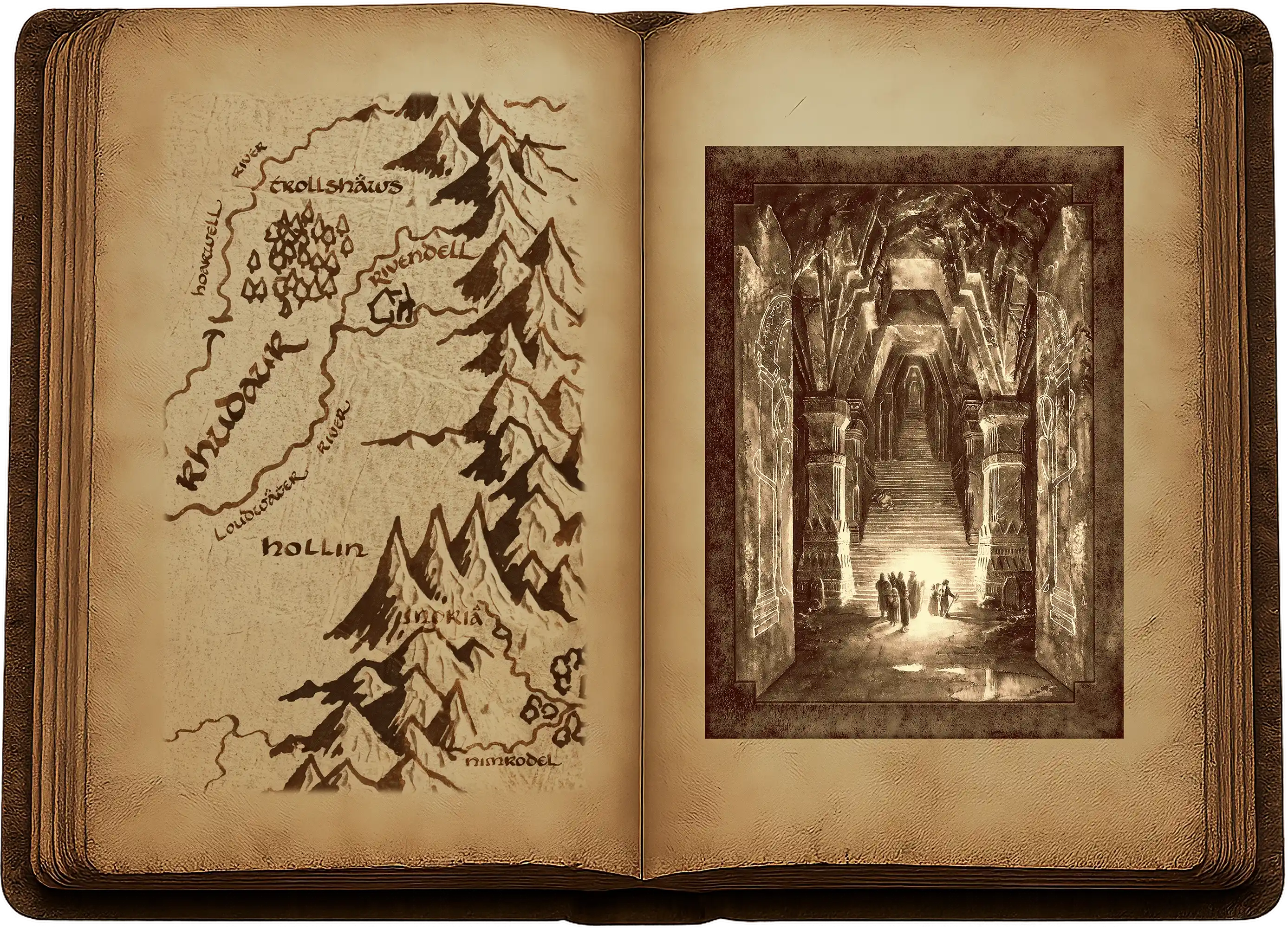 « Les mots sont dans la langue elfique de l’ouest de la Terre du Milieu aux Jours Anciens, répondit Gandalf. Mais ils ne nous apprennent rien d’important. Ils disent seulement : Les Portes de Durin, Seigneur de Moria. Parle, ami, et entre. Et en dessous, en petits caractères, il est écrit : Moi, Narvi, je les ai faites. Celebrimbor de Houssière a dessiné ces signes. »