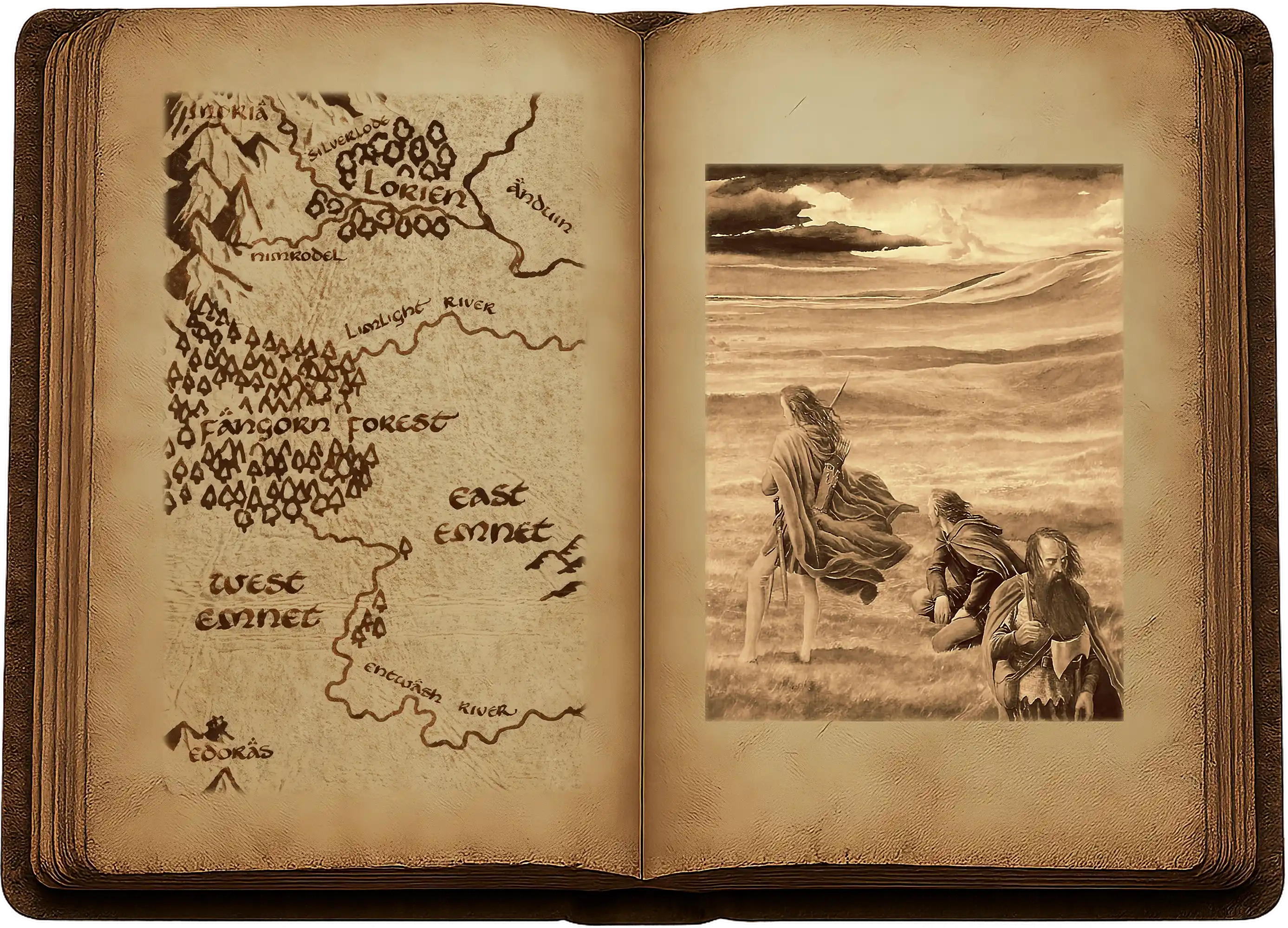 Devant eux, à l’est, ils apercevaient le Wold du Rohan, ces hautes plaines venteuses qu’ils avaient entrevues bien des jours auparavant, sur le Grand Fleuve. Au nord-ouest se dressait la sombre forêt de Fangorn : l’ombre de ses premières frondaisons était à dix lieues encore, et ses pentes plus éloignées se fondaient dans l’azur. Derrière luisait au loin, comme flottant sur un nuage gris, le crâne blanc du haut Methedras, dernière cime des Montagnes de Brume. Sortant de la forêt, l’Entévière, ici rapide et étroite, affluait jusqu’à eux entre de hautes berges. La piste des Orques se détournait des coteaux pour la rejoindre.