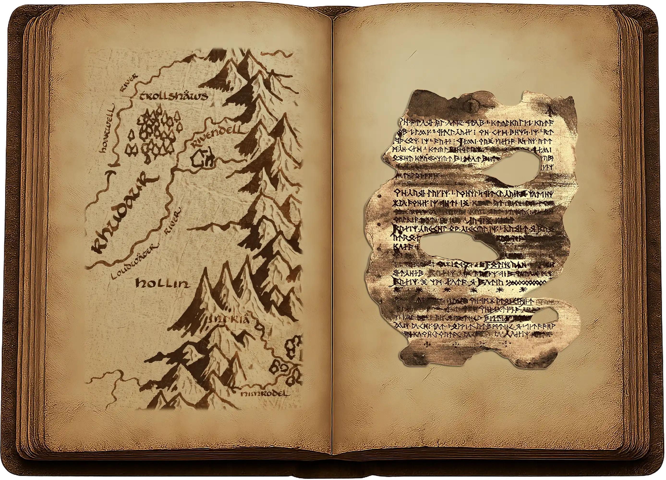 Aux quatre murs se voyaient de nombreuses niches taillées à même le roc, dans lesquelles se trouvaient de grands coffres de bois à armature de fer. Tous avaient été éventrés et pillés ; mais non loin du couvercle fracassé de l’un d’eux, gisaient les restes d’un livre. Tailladé, lardé de coups de couteau et partiellement brûlé, il était si souillé de noir et d’autres taches sombres, semblables à du sang séché, qu’il en devenait presque impossible à lire. Gandalf le ramassa avec précaution, mais les feuillets se craquelèrent et cassèrent quand il le déposa sur la dalle. Il l’étudia quelque temps sans mot dire. Debout à ses côtés, Frodo et Gimli purent voir, tandis qu’il tournait délicatement les pages, qu’elles étaient parcourues de maintes écritures différentes, en runes, tant de la Moria que du Val, et çà et là en lettres elfiques.