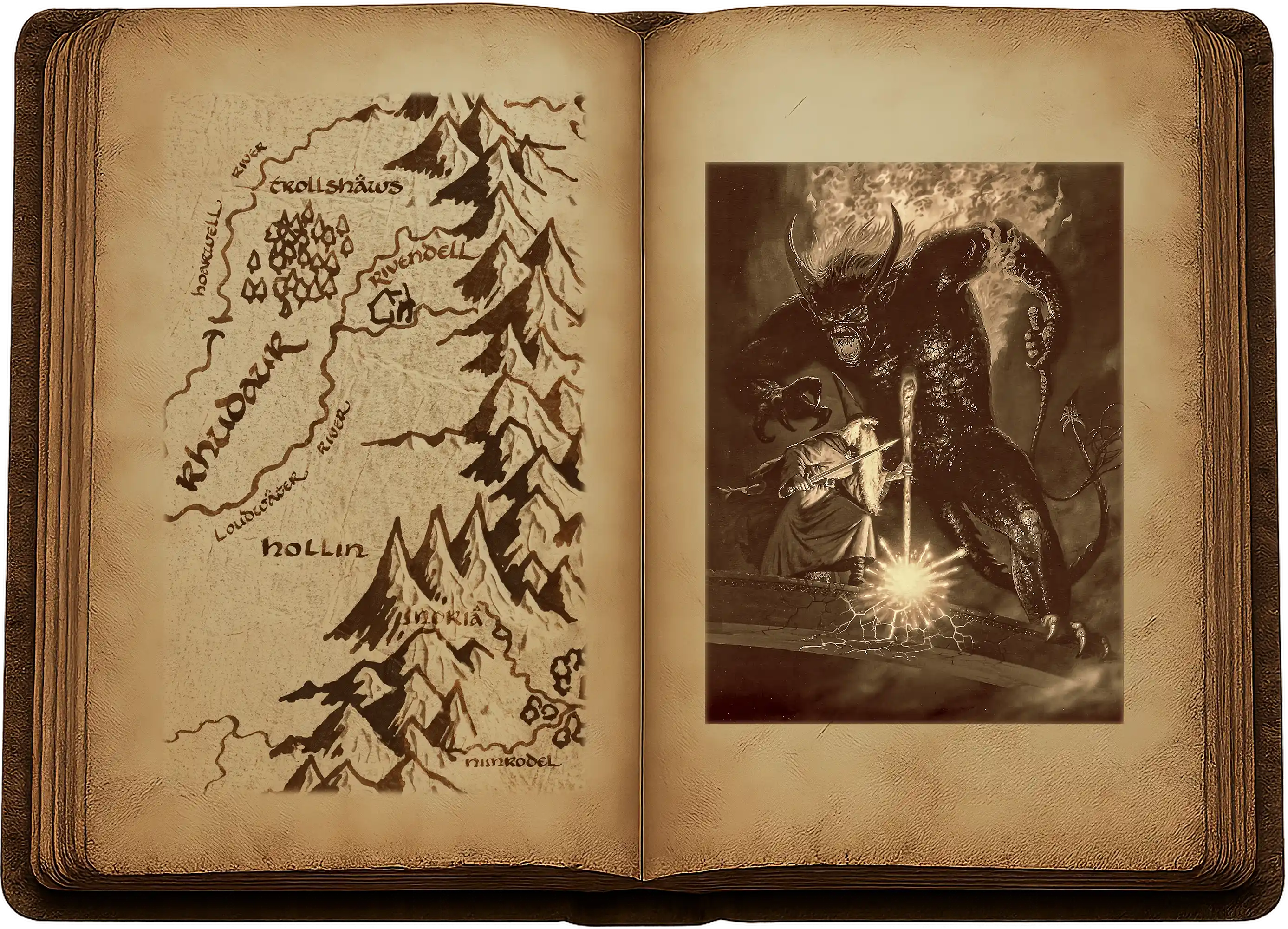 De l’ombre surgit une épée rouge feu. Glamdring brilla blanche en retour. Il y eut un choc retentissant et un jet de flammèches blanches. Le Balrog recula, et son épée vola en éclats fondus. Sur le pont, le magicien chancela, fit un pas en arrière et se tint de nouveau immobile.