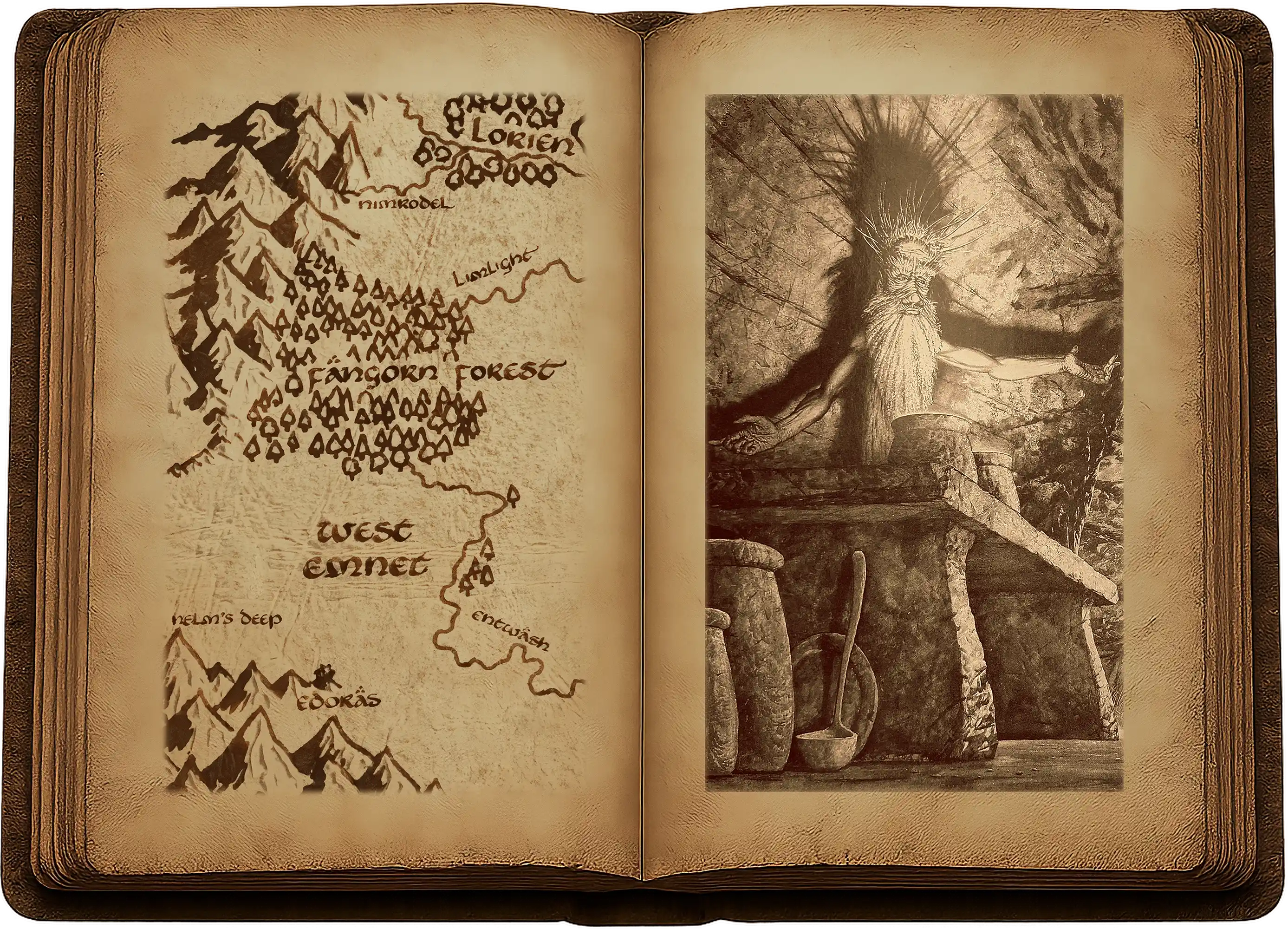 « Ceci est une maison d’Ent, dit-il, et il n’y a pas de sièges, hélas. Mais vous pouvez vous asseoir sur la table. » Soulevant les hobbits, il les installa sur la grande dalle de pierre, à six pieds au-dessus du sol : ils s’y assirent, balançant leurs jambes dans le vide et sirotant leur boisson.
