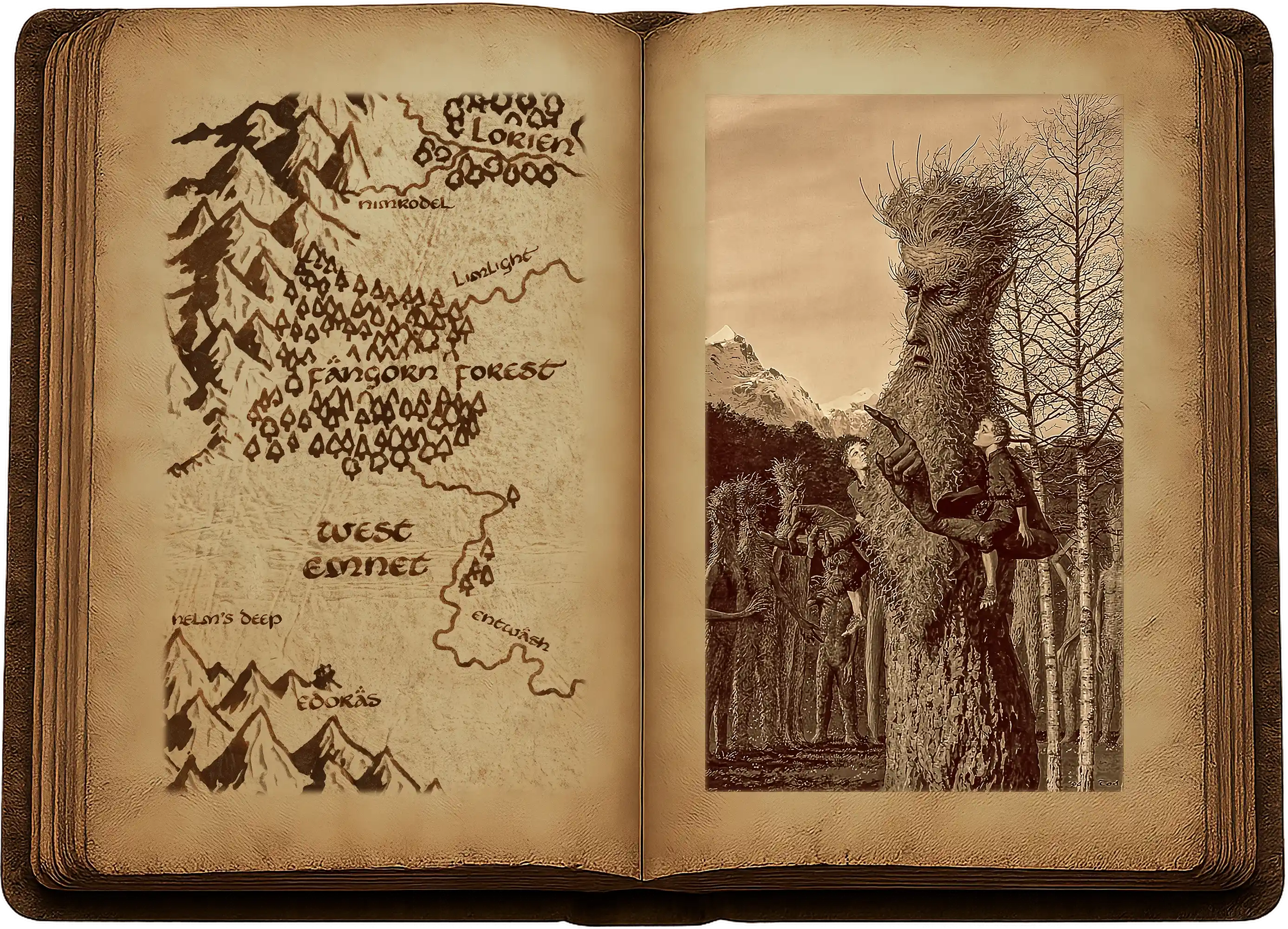 Il déposa les hobbits. Avant de s’éloigner, ils s’inclinèrent profondément. Cette prouesse amusa beaucoup les Ents, s’il fallait en croire le ton de leurs murmures et l’étincelle dans leurs yeux ; mais ils retournèrent bientôt à leurs propres affaires. Merry et Pippin gravirent le sentier venant de l’ouest et regardèrent par l’ouverture de la grande haie. De longues pentes boisées s’élevaient là-bas, à partir du bord de la combe ; et loin au-dessus d’elles, au-delà des sapins coiffant la dernière crête, se dressait, blanche et découpée, la cime d’une haute montagne. Au sud, sur leur gauche, ils pouvaient voir plonger la forêt dans des lointains grisâtres. Là, à l’horizon, se devinait une pâle lueur verte que Merry pensa être un aperçu des plaines du Rohan.