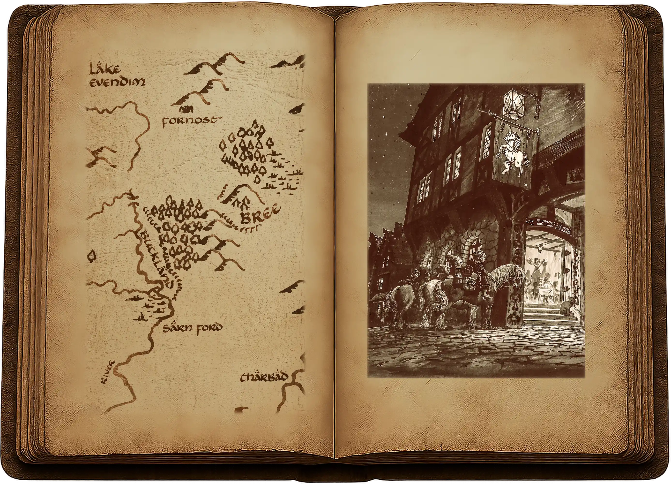 Même vue de dehors, l’auberge était assez agréable pour qui en avait l’habitude. Sa façade donnait sur la Route, et deux ailes partaient en arrière sur un terrain partiellement excavé dans les basses pentes de la colline, de sorte qu’au dos de l’édifice, les fenêtres du deuxième étage se trouvaient au niveau du sol. Une grande arche donnait accès à une cour entre les deux ailes, et sous cette arche, sur la gauche, s’ouvrait une grande porte en haut de quelques larges marches. La porte était ouverte et un flot de lumière en sortait. Au-dessus de l’arche se trouvait une lampe, sous laquelle se balançait une grande enseigne : un poney blanc et gras dressé sur ses pattes de derrière. Sur le linteau de la porte se lisait une inscription en lettres blanches : LE PONEY FRINGANT chez FILIBERT FLEURDEBEURRE. Plusieurs des fenêtres d’en bas laissaient voir de la lumière derrière d’épais rideaux.