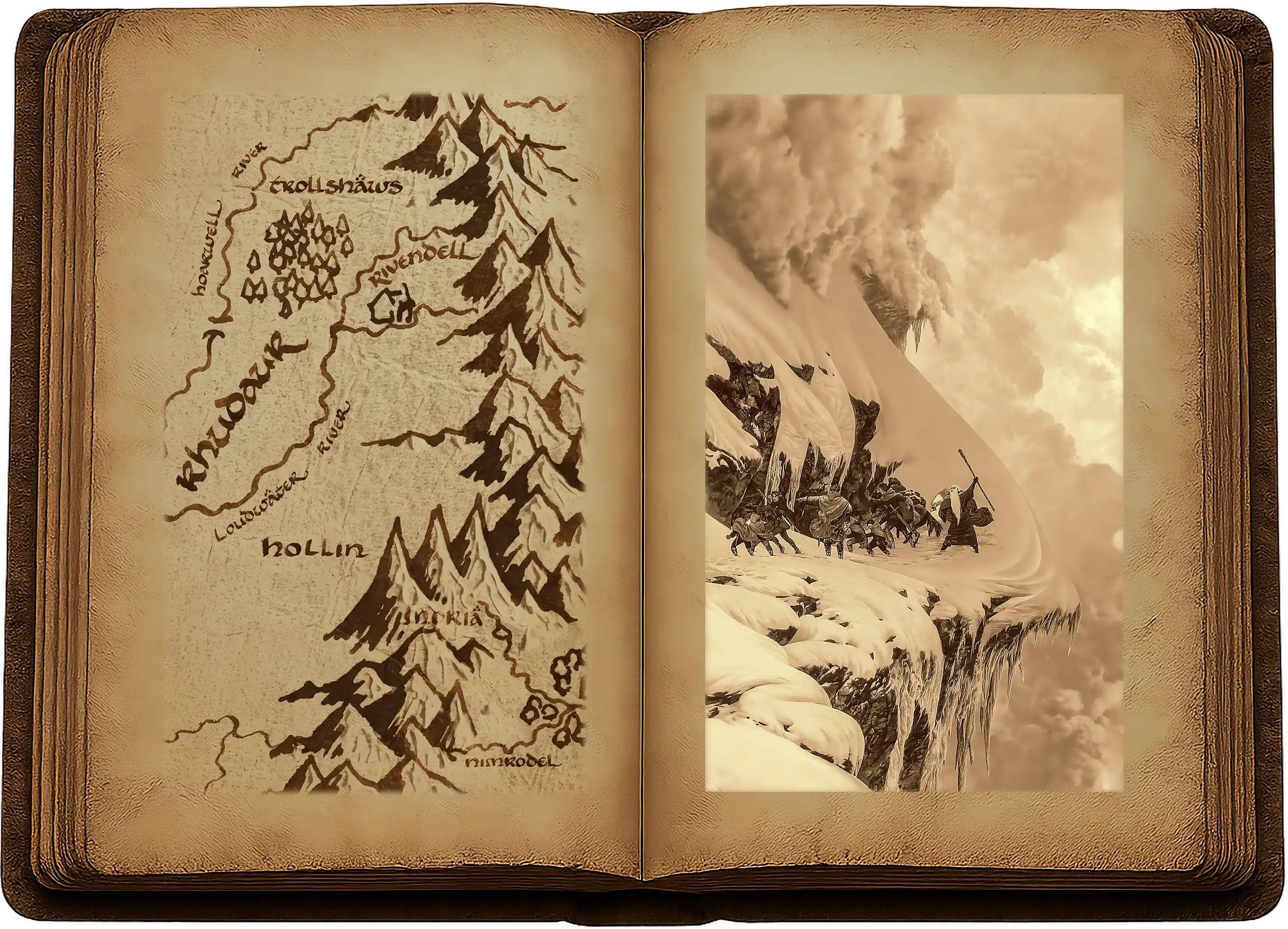 « D’après les signes que nous avons vus récemment, dit Gandalf, je crains que la Porte de Cornerouge ne soit surveillée ; et le temps qui se dessine derrière nous me fait également douter. Il pourrait y avoir de la neige. Nous devons autant que possible nous dépêcher. Même alors, il nous faudra plus de deux longues marches avant d’atteindre le sommet du col. L’obscurité viendra tôt ce soir. Nous devrons partir aussitôt que vous serez prêts. »