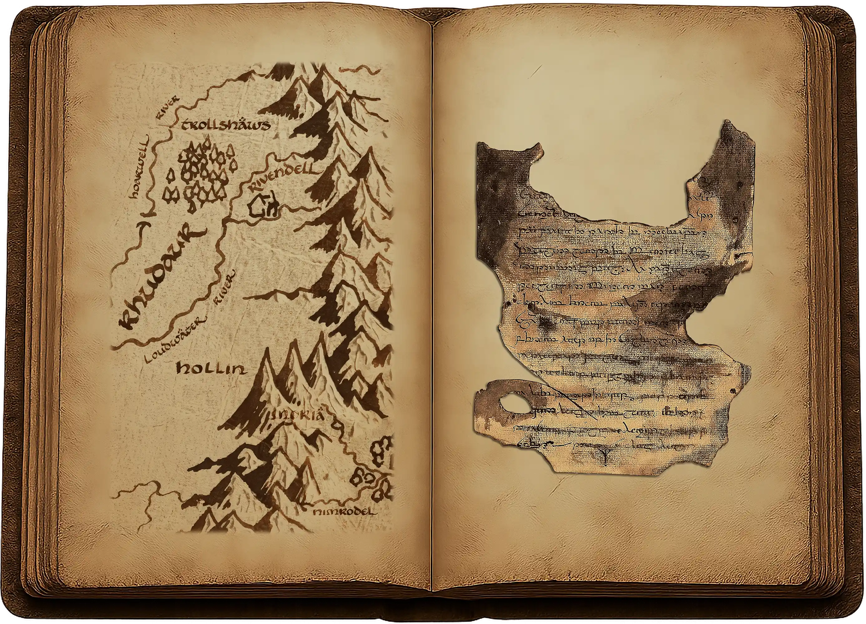 Aux quatre murs se voyaient de nombreuses niches taillées à même le roc, dans lesquelles se trouvaient de grands coffres de bois à armature de fer. Tous avaient été éventrés et pillés ; mais non loin du couvercle fracassé de l’un d’eux, gisaient les restes d’un livre. Tailladé, lardé de coups de couteau et partiellement brûlé, il était si souillé de noir et d’autres taches sombres, semblables à du sang séché, qu’il en devenait presque impossible à lire. Gandalf le ramassa avec précaution, mais les feuillets se craquelèrent et cassèrent quand il le déposa sur la dalle. Il l’étudia quelque temps sans mot dire. Debout à ses côtés, Frodo et Gimli purent voir, tandis qu’il tournait délicatement les pages, qu’elles étaient parcourues de maintes écritures différentes, en runes, tant de la Moria que du Val, et çà et là en lettres elfiques.