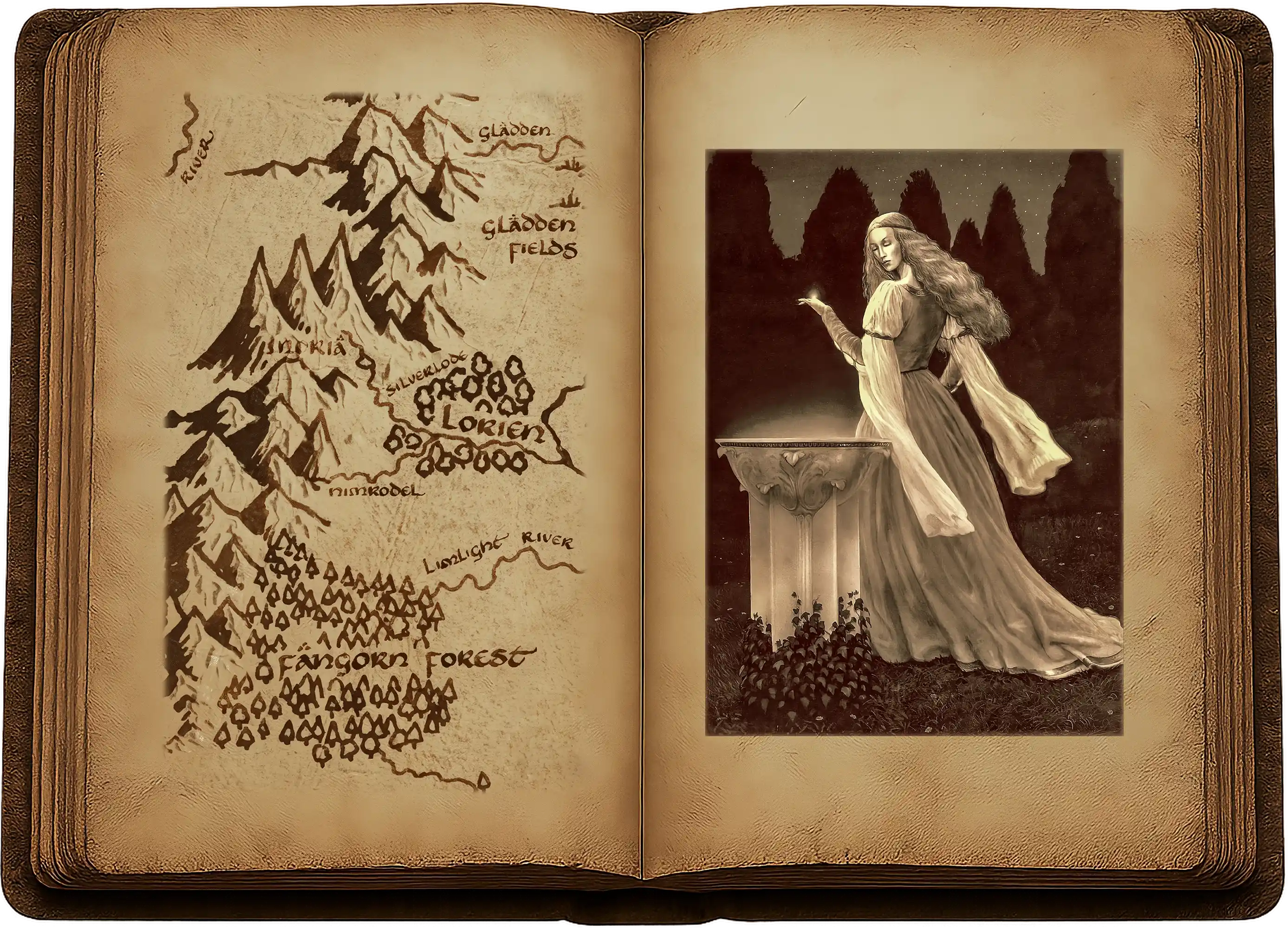 « Votre quête nous est connue, dit Galadriel en regardant Frodo. Nous n’en parlerons pas ici plus ouvertement. Mais ce n’est peut-être pas en vain si vous êtes venus chercher de l’aide en ce pays, comme Gandalf lui-même se proposait de le faire, de toute évidence. Car le Seigneur des Galadhrim est réputé le plus sage des Elfes de la Terre du Milieu, et un donneur de présents qui surpassent l’opulence des rois. Il réside dans l’Ouest depuis l’aube des jours, et j’ai vécu avec lui un nombre incalculable d’années ; car j’ai traversé les montagnes avant la chute de Nargothrond et de Gondolin, et ensemble, à travers les âges du monde, nous avons combattu dans la longue défaite.