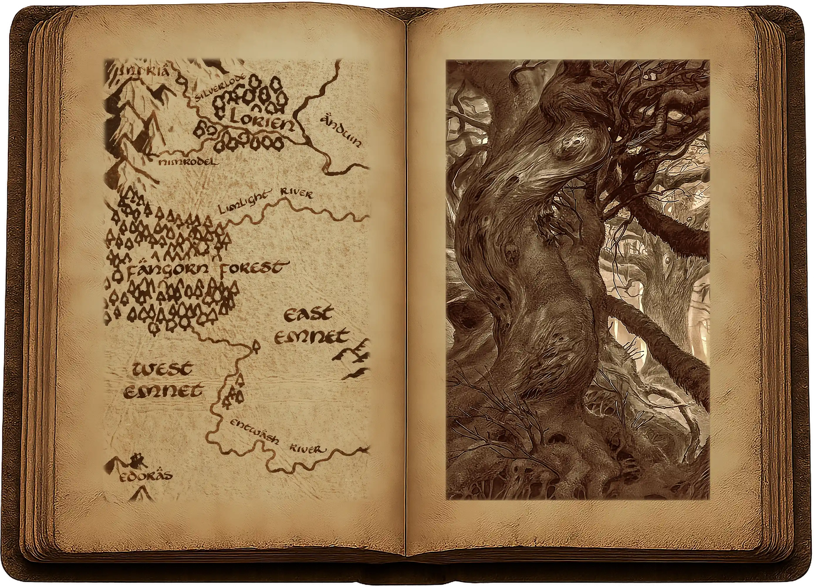 « Je devrai bientôt fourbir mes orteils si je veux pouvoir te rattraper. Assurément, c’est au tour du cousin Brandibouc de se mettre en avant. C’est ici qu’il entre en scène. Je ne pense pas que tu aies quelque idée d’où nous sommes ; pour ma part, j’ai fait meilleur usage de mes temps libres à Fendeval. Nous marchons vers l’ouest le long de l’Entévière. Le bout des Montagnes de Brume est devant nous, ainsi que la Forêt de Fangorn. »