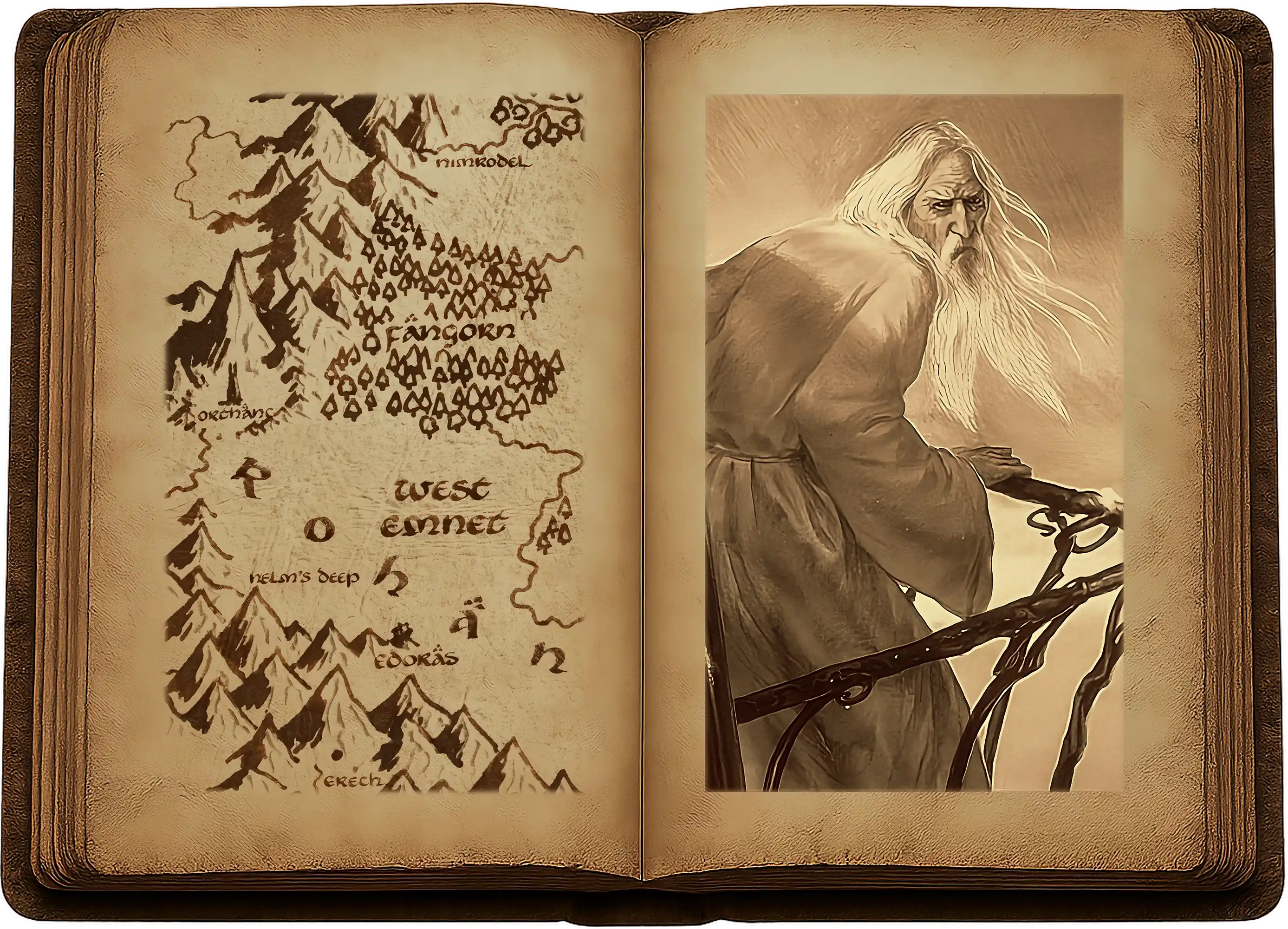 « Puis, tout à coup, il y eut un formidable branle-bas. Des trompettes sonnèrent, et les murs d’Isengard retentirent d’échos. Nous croyions qu’on nous avait découverts, que la bataille allait commencer. Mais il n’en était rien. Tous les combattants de Saruman partaient en guerre. Je ne sais pas grand-chose de ce conflit, ou des Cavaliers du Rohan, mais il semble que Saruman ait voulu en finir avec le roi et tous ses hommes en leur portant un coup fatal. Sous son ordre, Isengard fut vidé. J’ai vu partir l’ennemi : des files interminables d’Orques en marche, et des escadrons montés sur de grands loups. Et il y avait des troupes d’Hommes, aussi. Bon nombre d’entre eux portaient des torches, et dans le flamboiement, je pouvais voir leurs visages. La plupart étaient des hommes ordinaires, plutôt grands et bruns, l’air sévère mais pas spécialement mauvais. Mais il y en avait d’autres qui étaient horribles : ils avaient une taille d’homme mais un visage de gobelin, le teint cireux, les yeux louches et la mine hagarde. Et vous savez quoi, ils m’ont aussitôt fait penser à cet Homme du Sud qui était à Brie ; sauf que lui n’était pas aussi visiblement orquien que la plupart de ceux-là. »