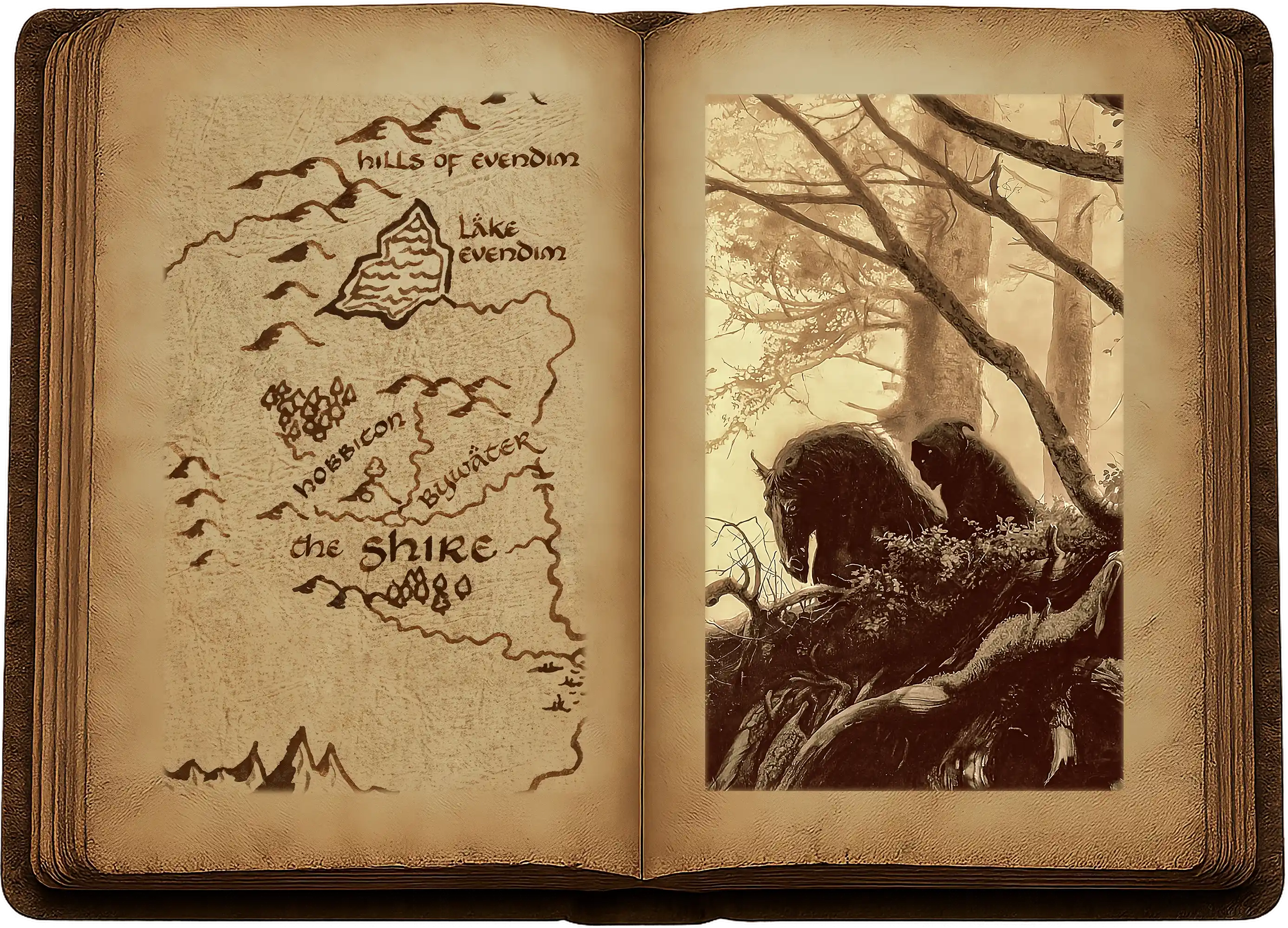 Non loin de l’embranchement, ils découvrirent par hasard la carcasse d’un arbre immense. Il était encore en vie, et des feuilles poussaient sur les rameaux apparus autour des vieux chicots qui soutenaient autrefois ses grands bras ; pourtant, il était creux, et l’on pouvait y entrer par une large fente du côté opposé à la route. Les hobbits s’y glissèrent et trouvèrent à l’intérieur un lit de feuilles mortes et de bois pourri sur lequel s’asseoir. Là, ils se reposèrent et prirent un léger repas, discutant à voix basse et prêtant l’oreille de temps à autre.