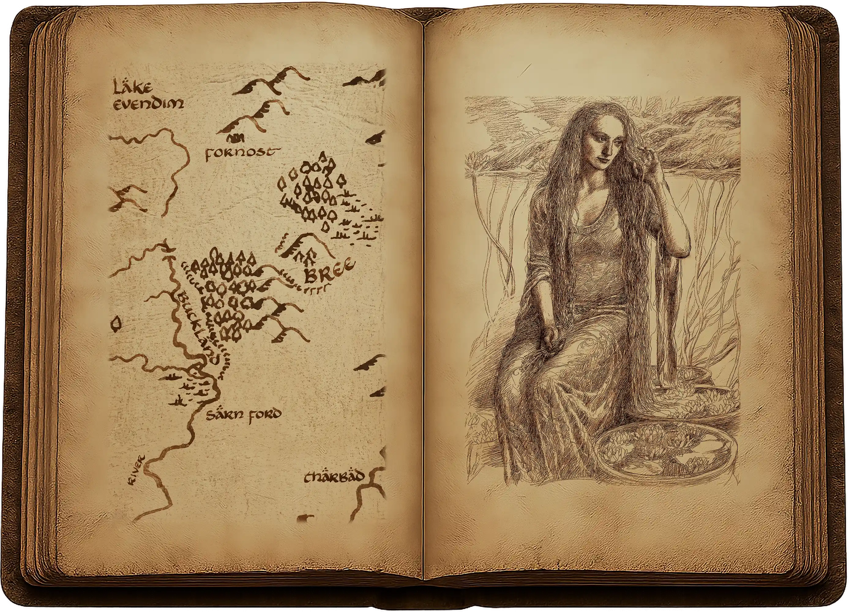 Quand ils eurent fini de manger, Baie-d’or chanta pour eux de nombreuses chansons, chansons qui naissaient joyeusement dans les collines et retombaient doucement dans le silence ; et au creux de ces silences, se déployaient dans leur esprit des mares et des eaux plus vastes qu’ils n’en avaient jamais connu, et regardant en leur sein ils voyaient le ciel se mirer sous eux, et les étoiles gisant dans les profondeurs telles des gemmes. Alors Baie-d’or leur souhaita de nouveau une bonne nuit et les laissa au coin du feu. Mais Tom semblait à présent tout à fait éveillé, et il les pressa de questions.