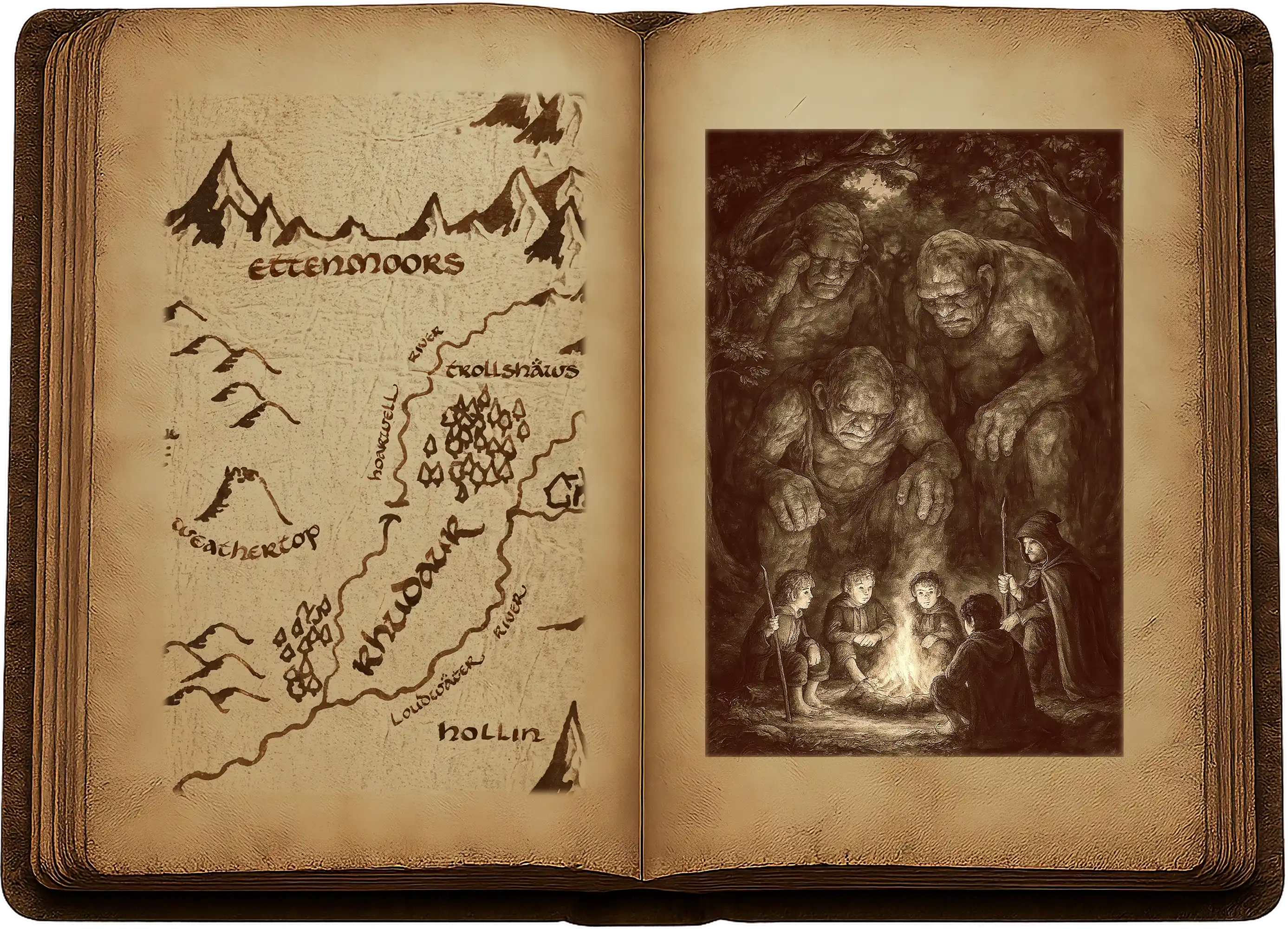 « J’étais loin de me douter que nous étions dans les parages ! » dit Pippin. Il connaissait bien cette histoire. Bilbo et Frodo l’avaient souvent racontée ; mais en fait, il n’y avait jamais cru qu’à moitié. Il continuait d’ailleurs à observer les trolls de pierre avec suspicion, se demandant si quelque magie ne pourrait pas les ramener soudain à la vie.