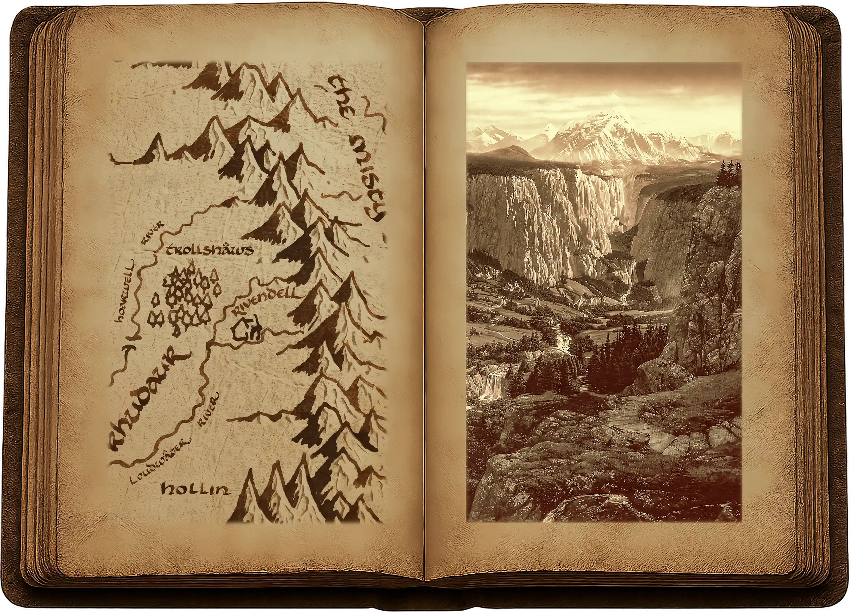 « J’arrivai enfin ici après une longue et dure route, ayant remonté la Fongrège à travers les Landes d’Etten pour ensuite redescendre du nord. Il me fallut près de quinze jours depuis Montauvent, car je ne pouvais aller à cheval parmi les hautes terres des trolls, et Scadufax dut me quitter. Je l’envoyai retrouver son maître ; mais une grande amitié est née entre nous, et il viendra à moi si dans le besoin je l’appelle. Ainsi donc, j’arrivai à Fendeval seulement deux jours avant l’Anneau ; et le danger qu’il courait était déjà connu ici – ce qui fut vraiment très heureux pour nous.